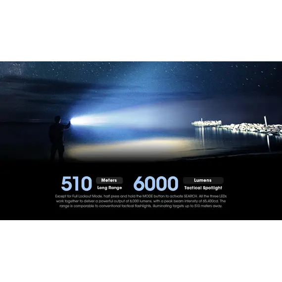 06. Εκτός από τη Λειτουργία πλήρους κλειδώματος, πατήστε έως το μέσον της διαδρομής του και κρατήστε πατημένο τον διακόπτη MODE για να ενεργοποιήσετε τον φωτισμό αναζήτησης. Και οι τρεις λυχνίες LED συνεργάζονται για να αποδώσουν έναν ισχυρό φωτισμό 6.000 lumens, με μέγιστη ένταση δέσμης 65.400 κεριά (cd). Η εμβέλεια είναι συγκρίσιμη με τους συμβατικούς επιχειρησιακούς φακούς, φωτίζοντας στόχους έως και 510 μέτρα μακριά.