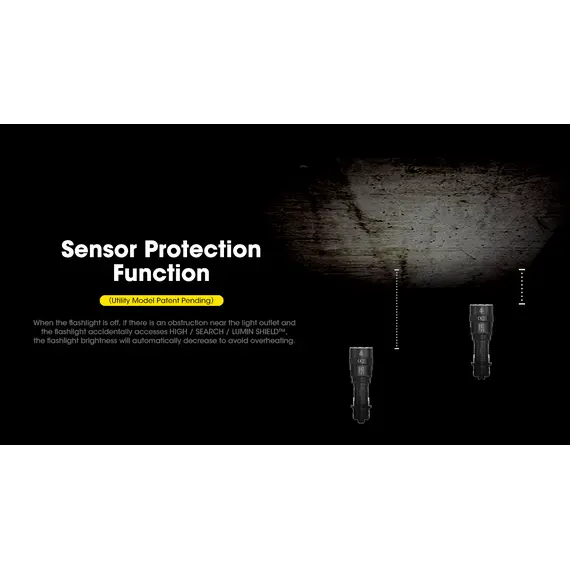 Όταν ο φακός είναι απενεργοποιημένος, εάν υπάρχει εμπόδιο μπροστά στην έξοδο φωτισμού και ο φακός ενεργοποιηθεί από λάθος στις φωτεινότητες HIGH/ SEARCH/ LUMIN SHIELD™ , η φωτεινότητα του φακού αυτόματα θα μειωθεί για να αποφευχθεί υπερθέρμανση.
