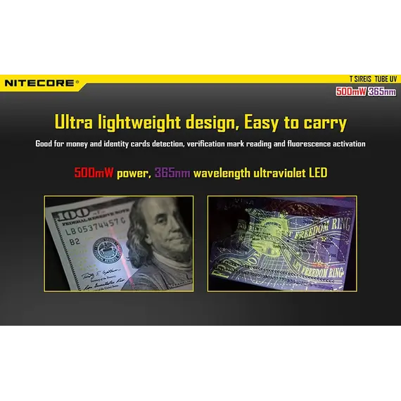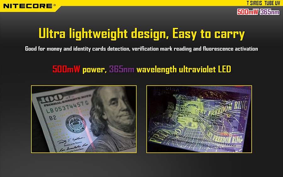 - Ιδανικός για χαρτονομίσματα, για ανίχνευση δελτίων ταυτότητας, ανάγνωση σημάτων επαλήθευσης και ενεργοποίηση φθοριζόντων υλικών.