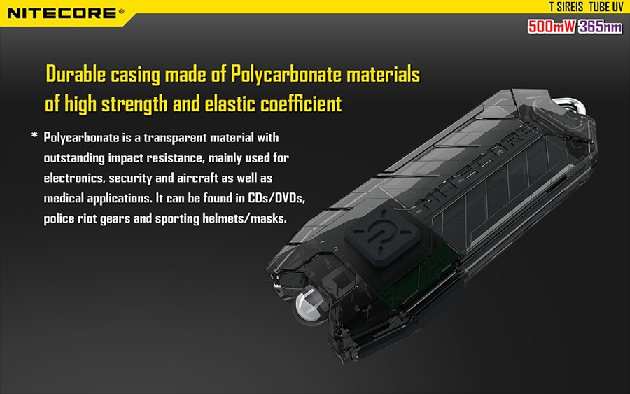 Πολύ ελαφρύς, επαναφορτιζόμενος (ενσωματωμένη μπαταρία) φακός μπρελόκ με LED υπεριώδους ακτινοβολίας. Ιδανικός για αναγνώριση πιστωτικών καρτών, σημάτων πιστοποίησης και γενικά ενεργοποίησης φθοριζόντων υλικών. Η ενσωματωμένη μπαταρία ιόντων λιθίου παρέχει συνεχόμενο φωτισμό έως και μία ώρα. Διαθέτει κύκλωμα προστασίας από την αποφόρτιση και την υπερφόρτιση καθώς επίσης προστασία από βραχυκύκλωμα. Η φόρτιση σταματά αυτόματα όταν φθάσει στο 100%. Μπλε ενδεικτική λυχνία ανάβει σταθερά κατά την διάρκεια της φόρτισης.