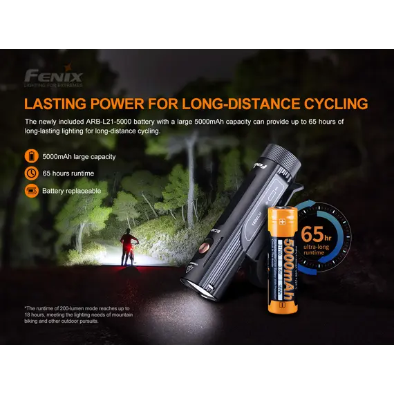 Διαθέτει διακόπτη ελέγχου on/off, με δυνατότητα στιγμιαίας ενεργοποίησης και πέντε λειτουργίες φωτισμού. Η μπαταρία των 5000mAh παρέχει άφθονη ισχύ για να διατηρεί αυτό το φακό σε λειτουργία έως και 65 ώρες και είναι επαναφορτιζόμενη USB Type-C. Στιβαρή κατασκευή, ο Φακός ποδηλάτου