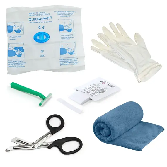 Όλο το περιεχόμενο συσκευάζεται σε μια εύχρηστη θήκη με την επιγραφή «ΠΡΩΤΕΣ ΒΟΗΘΕΙΕΣ», εξασφαλίζοντας την άμεση αναγνώρισή της σε επείγουσες καταστάσεις. Το κιτ περιλαμβάνει όλα τα αναγκαία στοιχεία για τη σωστή χρήση ενός απινιδωτή, προσφέροντας παράλληλα προστασία στον διασώστη κατά την επέμβαση.