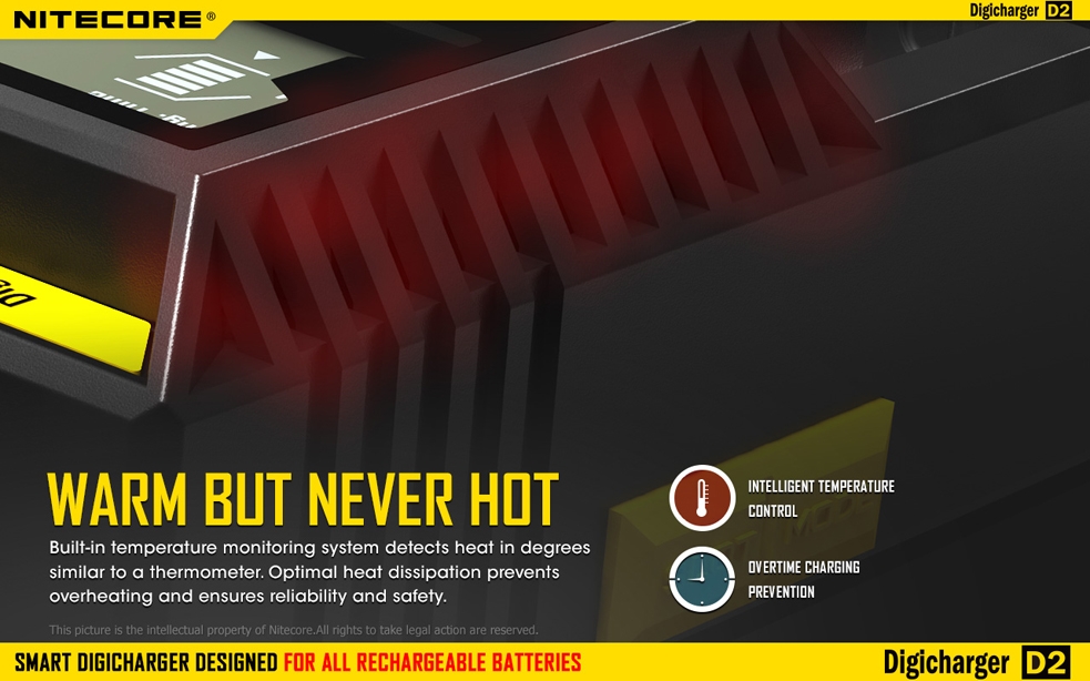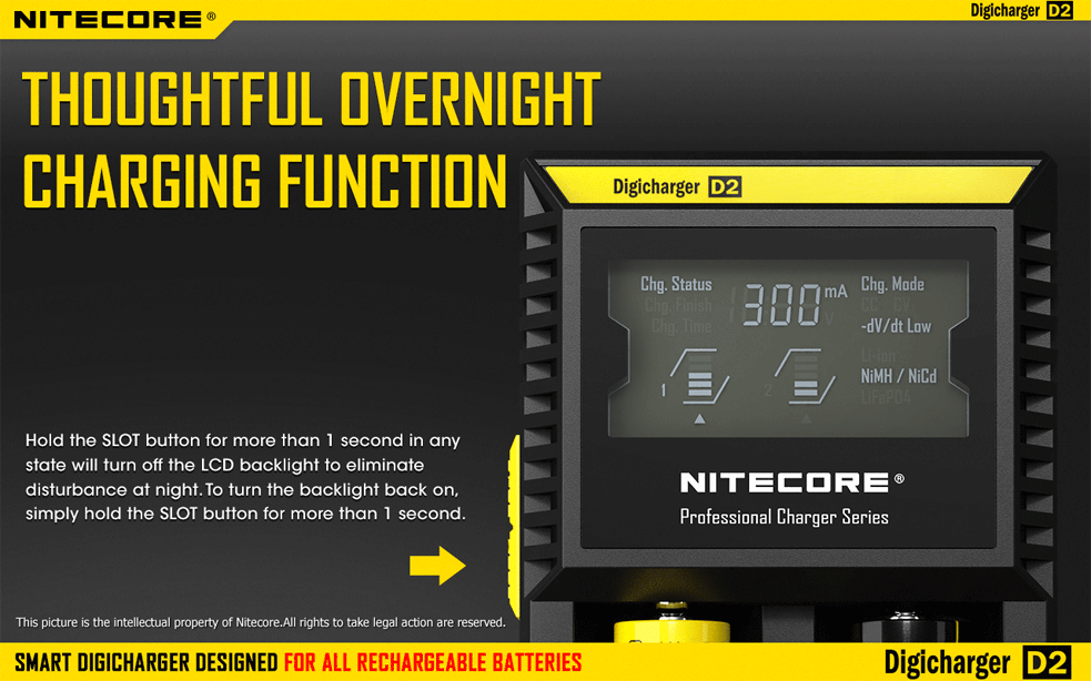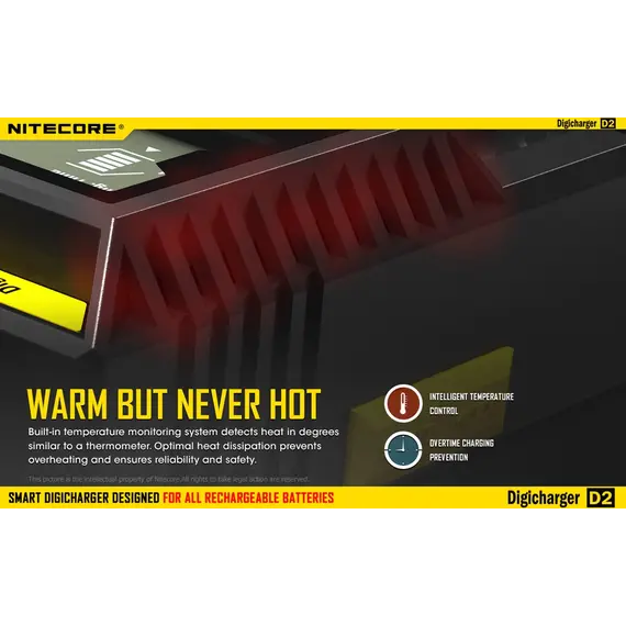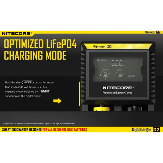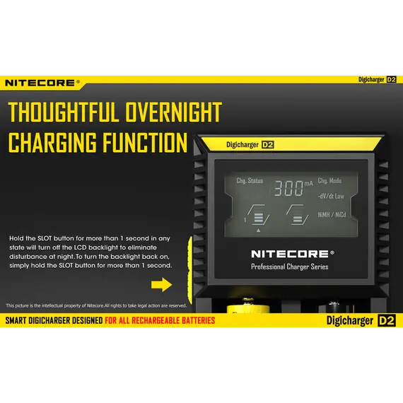 Επιπλέον, μια ενσωματωμένη ψηφιακή οθόνη LCD εμφανίζει με ευκρίνεια την πρόοδο της φόρτισης, την τάση, το ρεύμα και τον χρόνο, ενώ μια έξυπνη αυτόματη λειτουργία απενεργοποίησης τερματίζει το ρεύμα όταν ολοκληρωθεί η φόρτιση. Ο Nitecore D2: Παγκοσμίως ο πιο προηγμένος πλήρως αυτόματος ψηφιακός φορτιστής. Είναι τόσο απλό τοποθέτηση, ανίχνευση και φόρτιση.