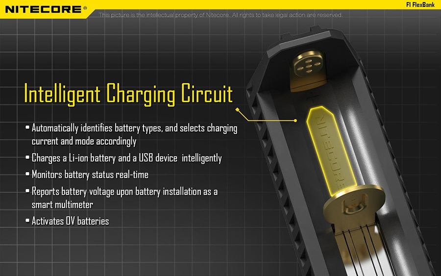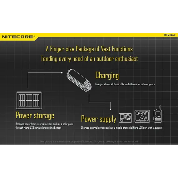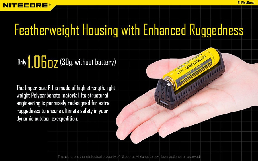 Εύχρηστος, πολυχρηστικός φορτιστής μίας θέσης της Nitecore. Φορτίζει από USB και μπορεί να δώσει το ρεύμα της μπαταρίας για φόρτιση άλλης συσκευής (power bank). Σχεδιασμένος για εξωτερικές δραστηριότητες, μικρός, ελαφρύς, ανθεκτικός.