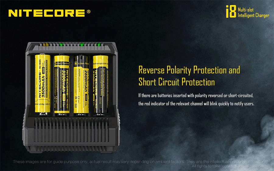 Διαθέτει προστασία από την ανάποδη πολικότητα και προστασία από βραχυκυκλώματα. Αν για παράδειγμα οι μπαταρίες τοποθετηθούν λανθασμένα ή βραχυκυκλώσουν, η κόκκινη ενδεικτική λυχνία της ανάλογης θέσης φόρτισης θα αρχίσει να αναβοσβήνει γρήγορα για να ενημερώσει τον χειριστή. Ο i8 είναι ικανός να ενεργοποιήσει εξαντλημένες μπαταρίες Li-ion που διαθέτουν κύκλωμα προστασίας. Μετά την τοποθέτηση τέτοιων μπαταριών σε οποιαδήποτε θέση φόρτισης, ξεκινά η διαδικασία ελέγχουν και ενεργοποίησης της μπαταρίας πριν ξεκινήσει η φόρτισης της.
