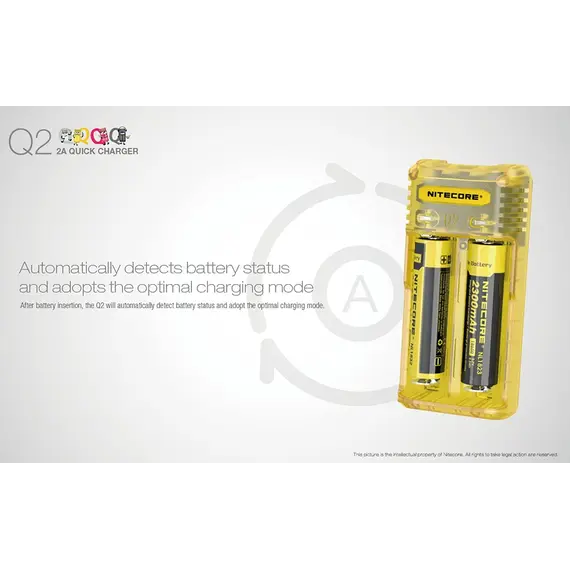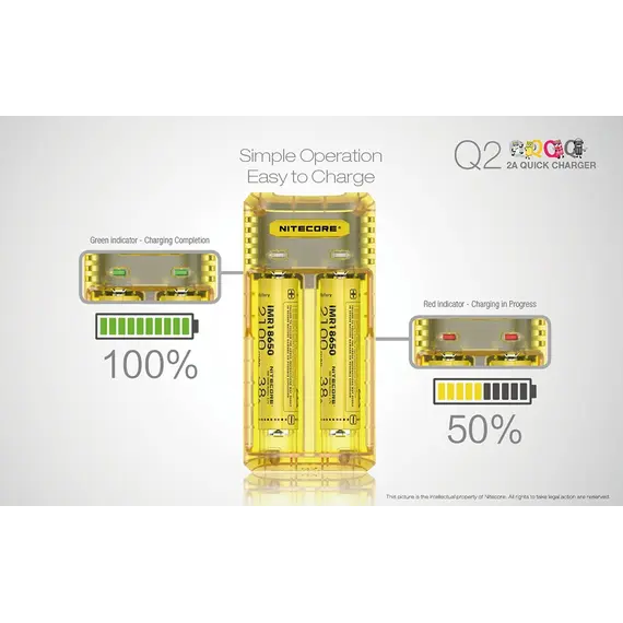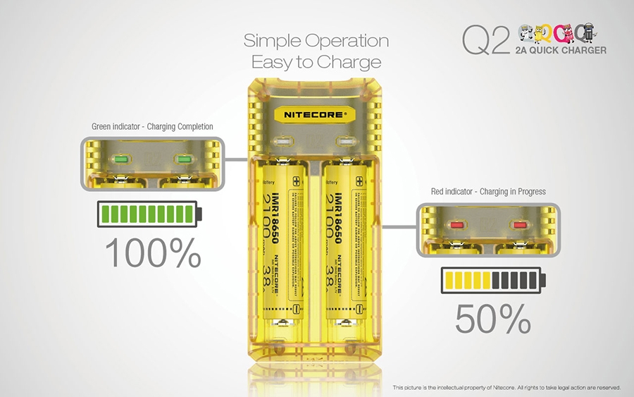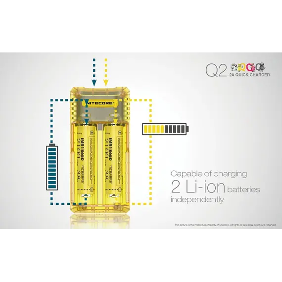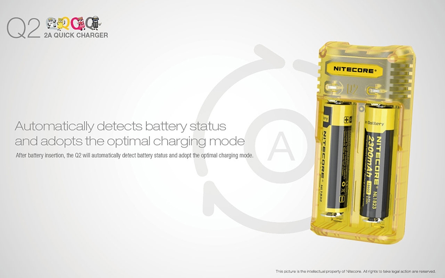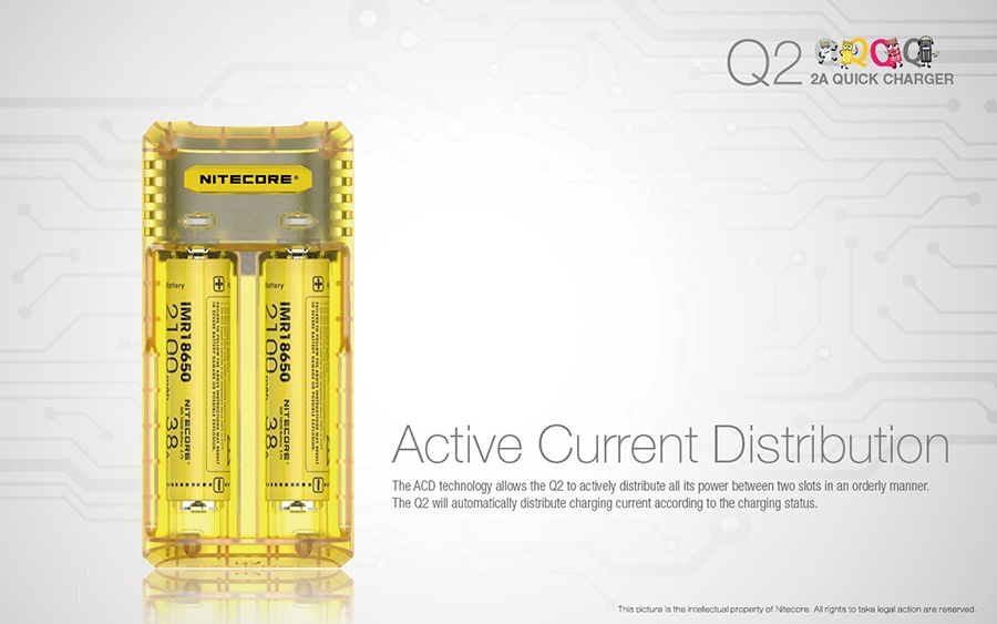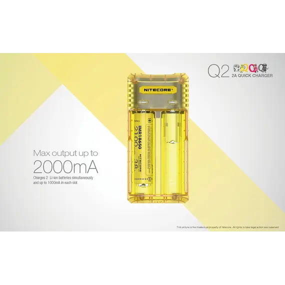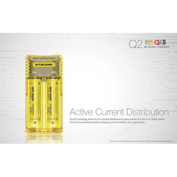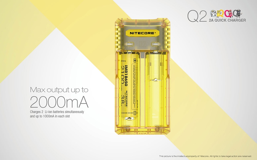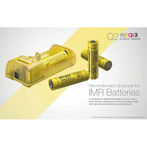 Μέγιστο ρεύμα φόρτισης έως και 2000mA, φορτίζει 2 μπαταρίες Li-ion ταυτόχρονα και μέχρι 1000mA σε κάθε θέση φόρτισης. Επαναστατική αναβάθμιση για μπαταρίες IMR, ο Q2 ενσωματώνει ένα βελτιωμένο σύστημα φόρτισης για μπαταρίες IMR που είναι ικανό να ελέγχει όλη την διαδικασία φόρτισης, εξασφαλίζοντας ότι το τελικό ρεύμα είναι πάντα σε ασφαλή όρια που βοηθά τα μέγιστα στην παράταση της διάρκειας ζωής των μπαταριών.