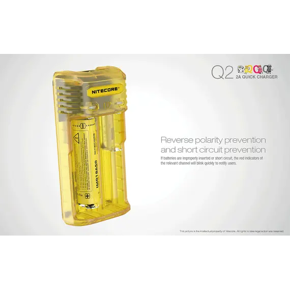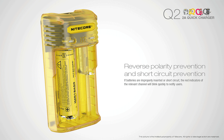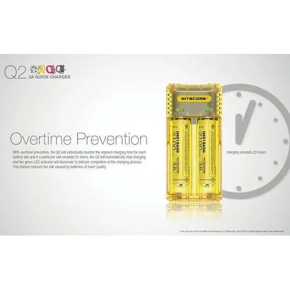Ο Q2 διαθέτει προστασία από ανάποδη πολικότητα και προστασία από βραχυκύκλωμα. Επίσης ο Q2 έχει την ικανότητα να ενεργοποιεί εξαντλημένες μπαταρίες Li-ion με κύκλωμα προστασίας. Μετά την τοποθέτηση τους ο Q2 αυτόματα θα τις ελέγξει και θα τις ενεργοποιήσει και μετά θα τις φορτίσει. Με την προστασία από υπερβολική φόρτιση ο Q2 ελέγχει ανεξάρτητα κάθε θέση φόρτισης σε σχέση με τον χρόνο και σταματά την φόρτιση όταν αυτή ξεπεράσει τις 20 ώρες.