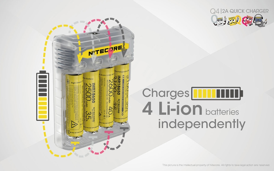 Ανιχνεύει αυτόματα την κατάσταση της μπαταρίας και προσαρμόζει την ιδανική μέθοδο φόρτισης. Διαθέτει προστασία ανάποδης πολικότητας και προστασία από βραχυκύκλωμα. Είναι ικανός να ενεργοποιήσει εξαντλημένες μπαταρίες με κύκλωμα προστασίας. Μετά την τοποθέτηση των μπαταριών ο Q4 τις ελέγχει και τις ενεργοποιεί αν χρειάζεται. Με την προστασία υπερβολικής φόρτισης ο Q4 ελέγχει ανεξάρτητα την κάθε θέση φόρτισης και αυτόματα σταματά την φόρτιση εάν αυτή ξεπεράσει τις 15 ώρες. Αυτή η λειτουργία μειώνει το ρίσκο που μπορεί να προκληθεί από μπαταρίες χαμηλής ποιότητας.