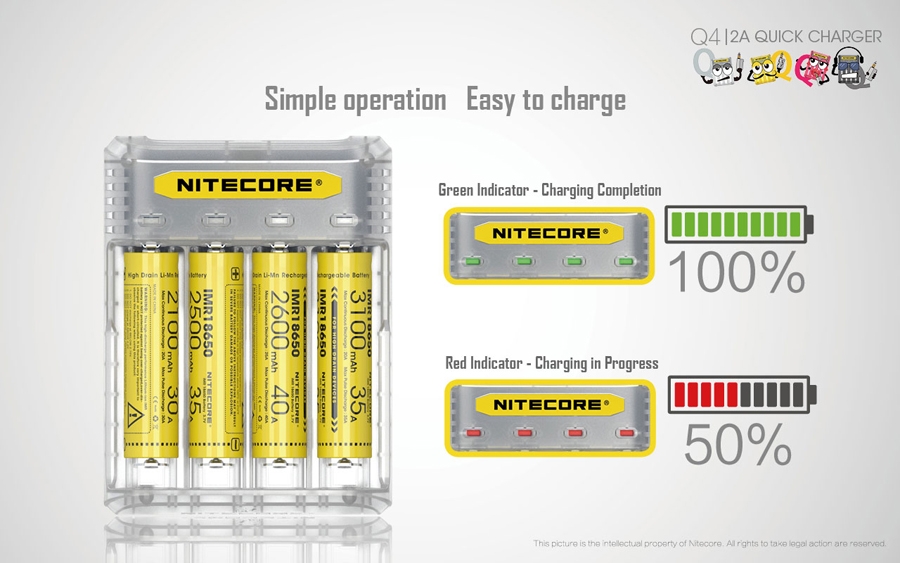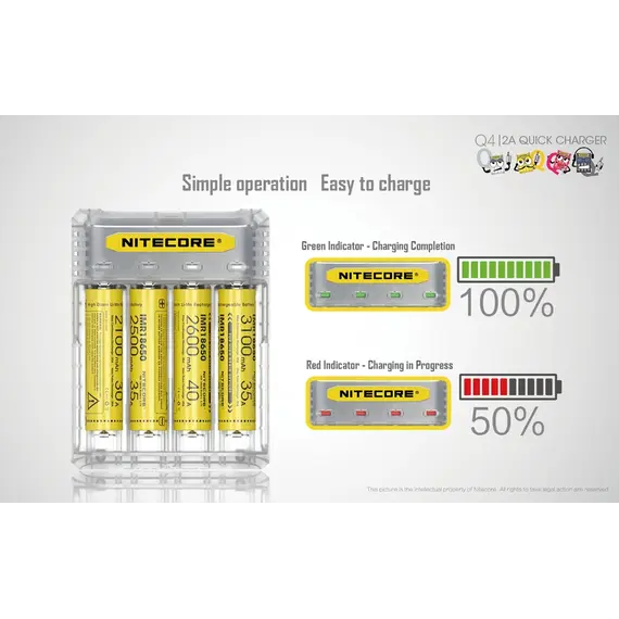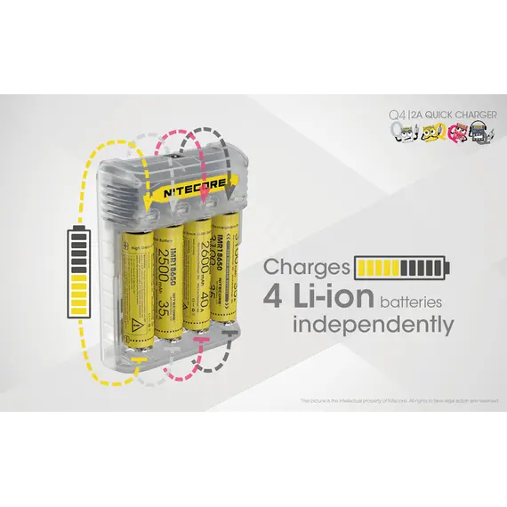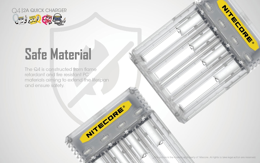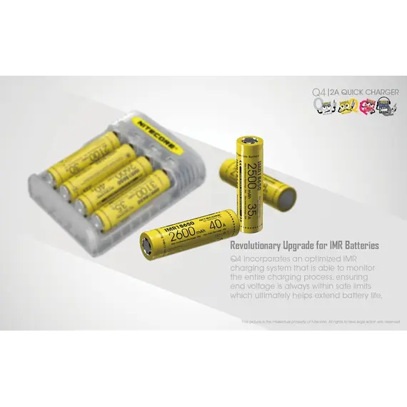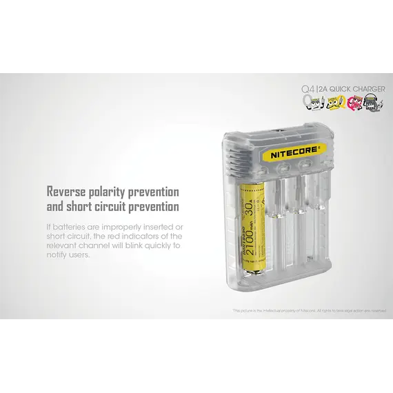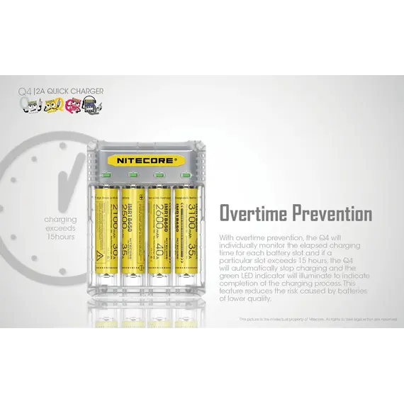 Ανιχνεύει αυτόματα την κατάσταση της μπαταρίας και προσαρμόζει την ιδανική μέθοδο φόρτισης. Διαθέτει προστασία ανάποδης πολικότητας και προστασία από βραχυκύκλωμα. Είναι ικανός να ενεργοποιήσει εξαντλημένες μπαταρίες με κύκλωμα προστασίας. Μετά την τοποθέτηση των μπαταριών ο Q4 τις ελέγχει και τις ενεργοποιεί αν χρειάζεται. Με την προστασία υπερβολικής φόρτισης ο Q4 ελέγχει ανεξάρτητα την κάθε θέση φόρτισης και αυτόματα σταματά την φόρτιση εάν αυτή ξεπεράσει τις 15 ώρες. Αυτή η λειτουργία μειώνει το ρίσκο που μπορεί να προκληθεί από μπαταρίες χαμηλής ποιότητας.