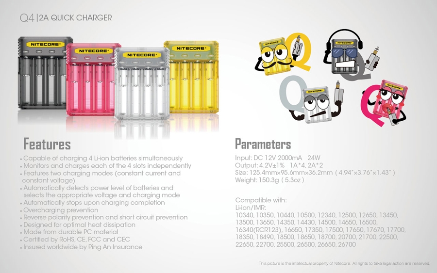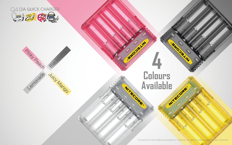 Ολοκαίνουρια σειρά φορτιστών Q, με ρέυμα φόρτισης έως και 1000mA σε κάθε θέση φόρτισης. Οι φορτιστές Q4 έχουν ένα επαναστατικό σύστημα φόρτισης για μπαταρίες IMR και φορτίζει τέσσερις μπαταρίες Li-ion ανεξάρτητα.