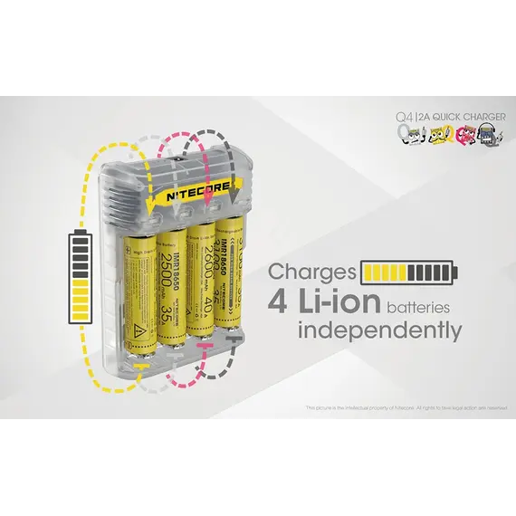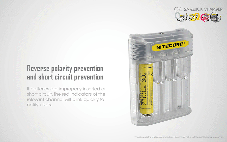 Ανιχνεύει αυτόματα την κατάσταση της μπαταρίας και προσαρμόζει την ιδανική μέθοδο φόρτισης. Διαθέτει προστασία ανάποδης πολικότητας και προστασία από βραχυκύκλωμα. Είναι ικανός να ενεργοποιήσει εξαντλημένες μπαταρίες με κύκλωμα προστασίας. Μετά την τοποθέτηση των μπαταριών ο Q4 τις ελέγχει και τις ενεργοποιεί αν χρειάζεται. Με την προστασία υπερβολικής φόρτισης ο Q4 ελέγχει ανεξάρτητα την κάθε θέση φόρτισης και αυτόματα σταματά την φόρτιση εάν αυτή ξεπεράσει τις 15 ώρες. Αυτή η λειτουργία μειώνει το ρίσκο που μπορεί να προκληθεί από μπαταρίες χαμηλής ποιότητας.