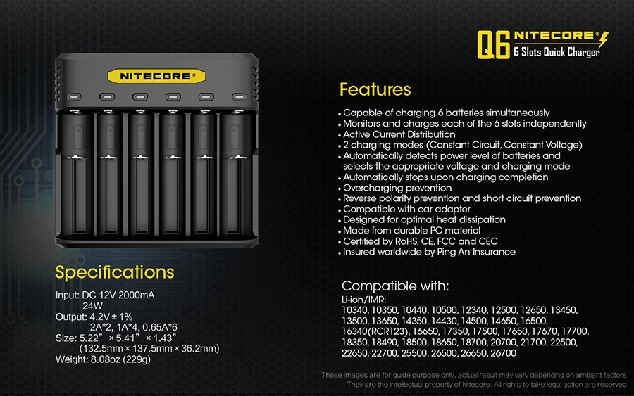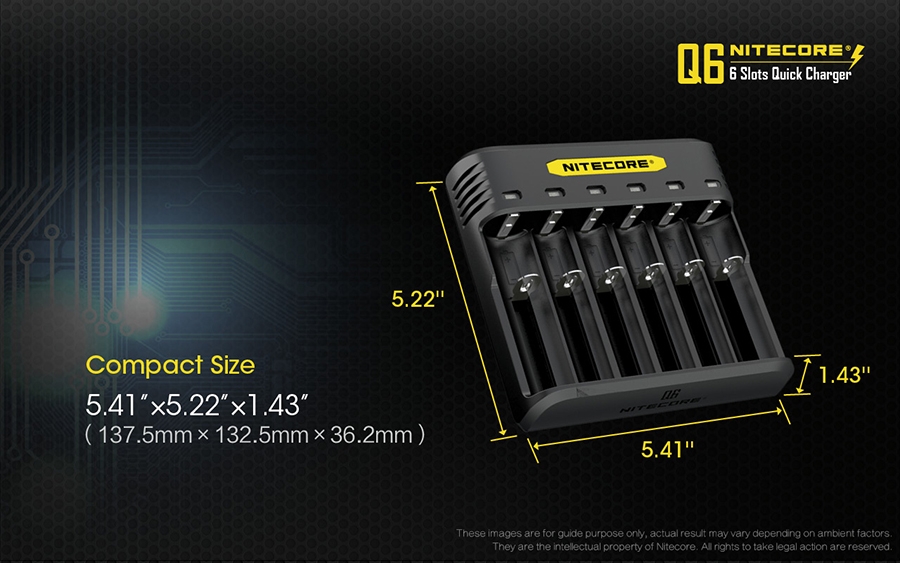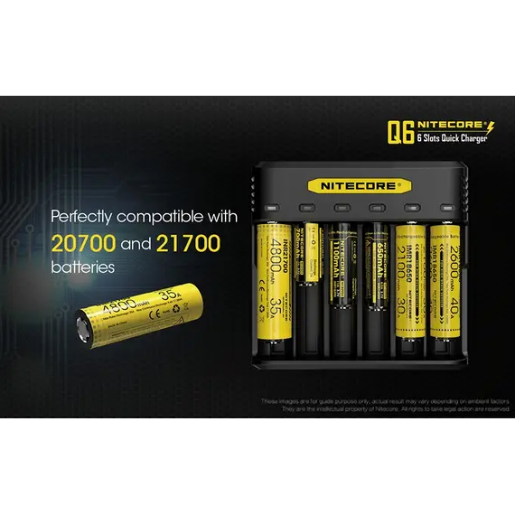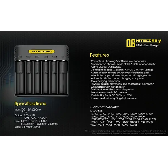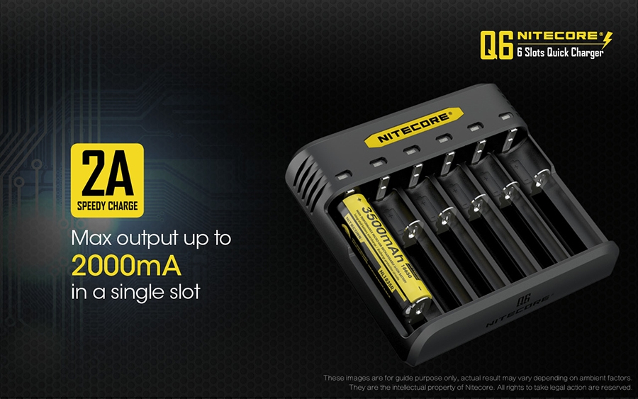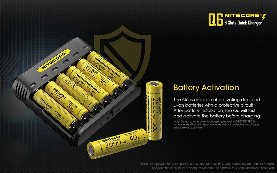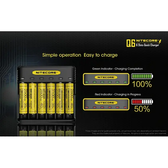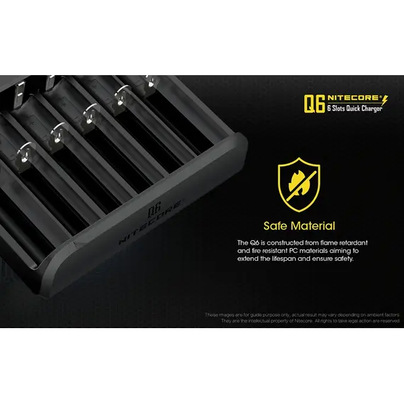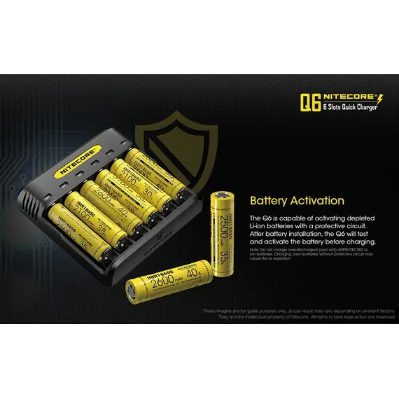Οι 6 μπαταρίες Li-ion φορτίζουν ανεξάρτητα. Το βελτιωμένο σύστημα φόρτισης για μπαταρίες IMR είναι ικανό να ελέγχει όλη τη διαδικασία φόρτισης, εξασφαλίζοντας ότι η τάση φόρτισης είναι πάντα μέσα στα ασφαλή όρια έτσι ώστε να μεγαλώνει η διάρκεια ζωής των μπαταριών. Συμβατός με αντάπτορα αυτοκινήτου . Ανιχνεύει αυτόματα το επίπεδο ενέργειας και επιλέγει την μέθοδο φόρτισης. Διαθέτει προστασία ανάποδης πολικότητας και βραχυκυκλώματος.