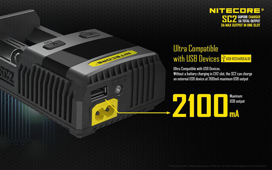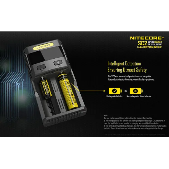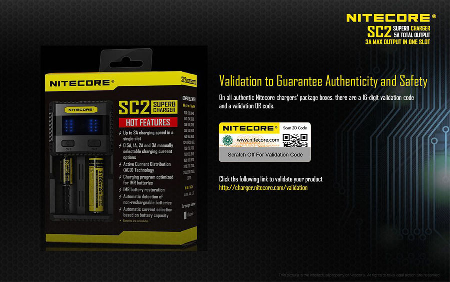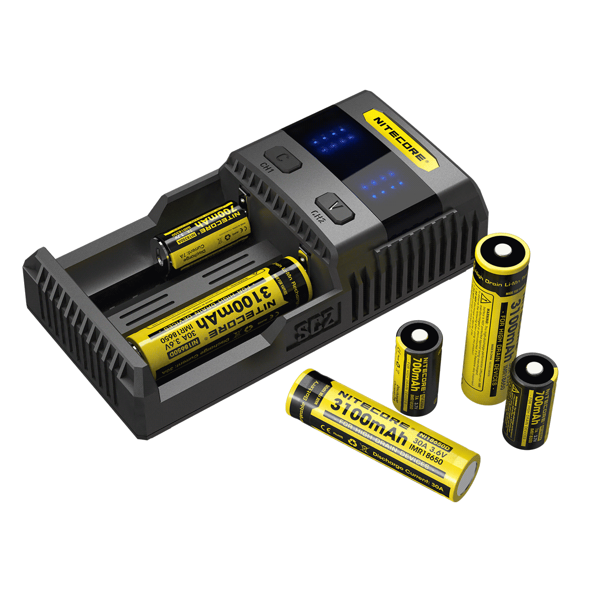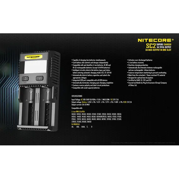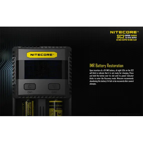 Νέος, ποιοτικός, ΤΑΧΥ-φορτιστής από την Nitecore. Δυνατότητα επιλογής του ρεύματος φόρτισης (0.5Α, 1Α, 2Α, 3Α), πρόγραμμα φόρτισης βελτιωμένο για μπαταρίες IMR, Δυνατότητα αποκατάστασης μπαταρίας IMR, αυτόματη αναγνώριση μη-επαναφορτιζόμενων μπαταριών λιθίου, αυτόματη επιλογή του ρεύματος φόρτισης ανάλογα με την χωρητικότητα της μπαταρίας. Μπορεί να φορτίσει μία μπαταρία 3000mAh μέσα σε 1,5 ώρες ! Μπορεί να φορτίσει μία εξωτερική συσκευή με USB με μέγιστο ρεύμα 2100mA (όταν η θέση 2 είναι κενή).