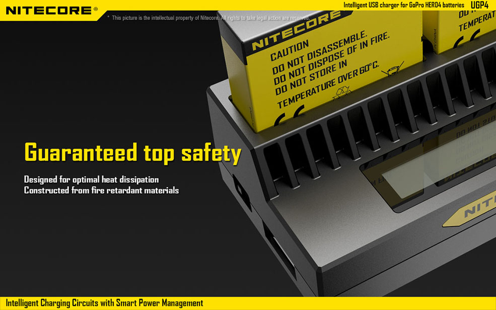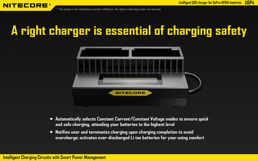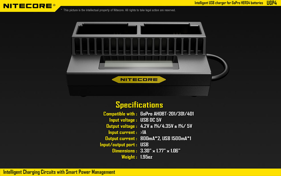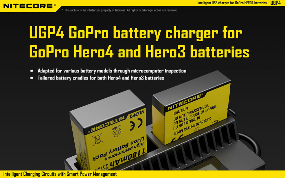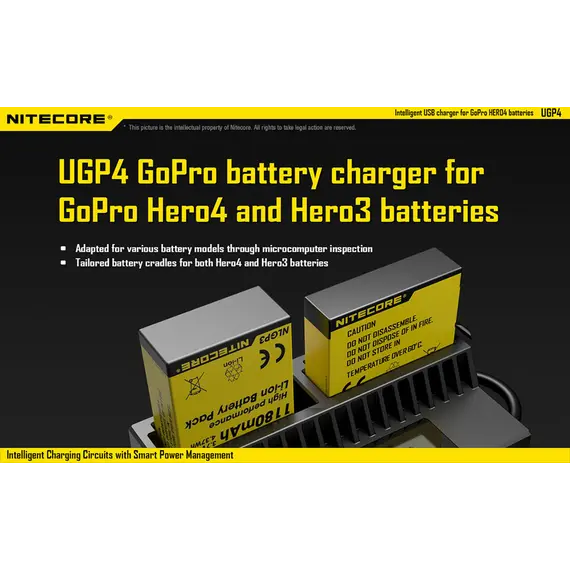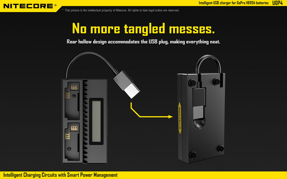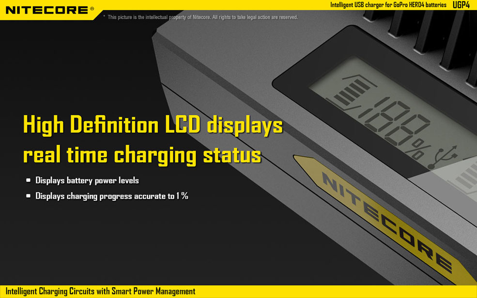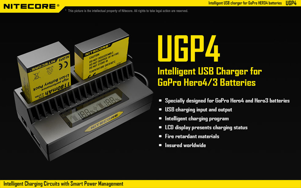 Έξυπνος φορτιστής USB, ειδικά σχεδιασμένος για μπαταρίες GoPro Hero4 / Hero3. Διαθέτει οθόνη LCD για την ένδειξη της κατάστασης φόρτισης. Κατασκευασμένος από υλικά ανθεκτικά στην φωτιά