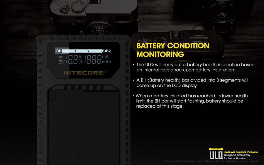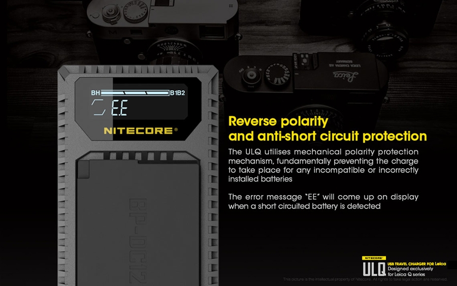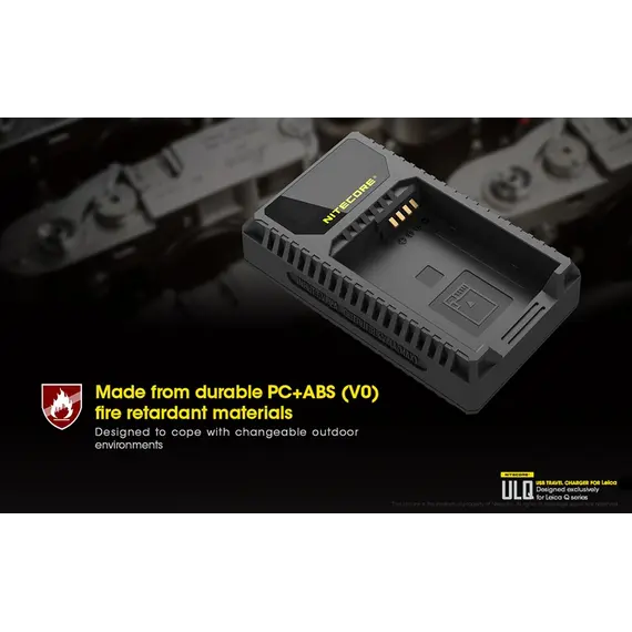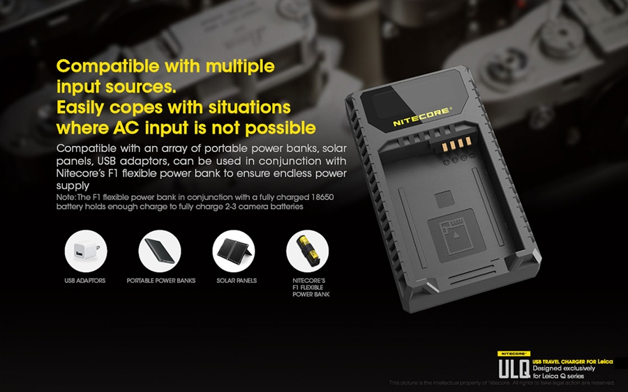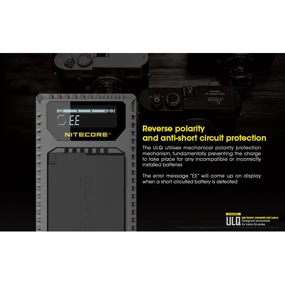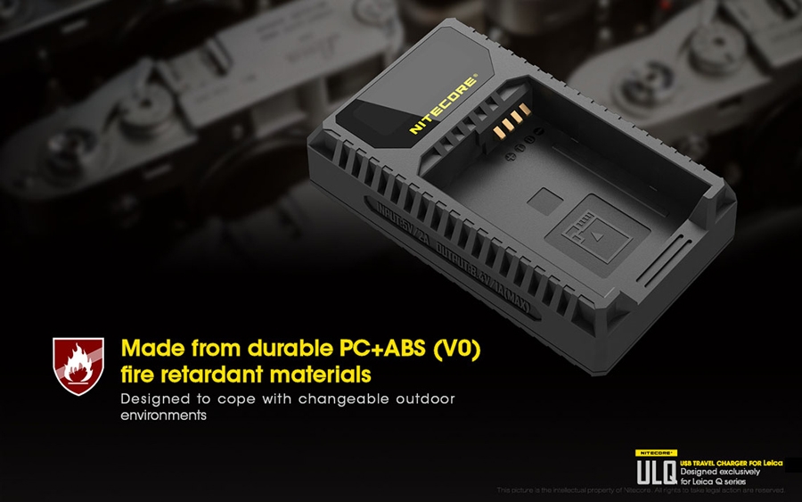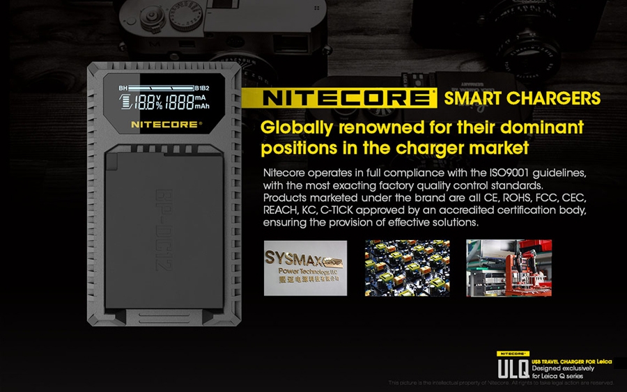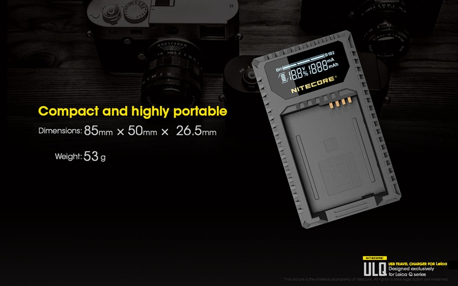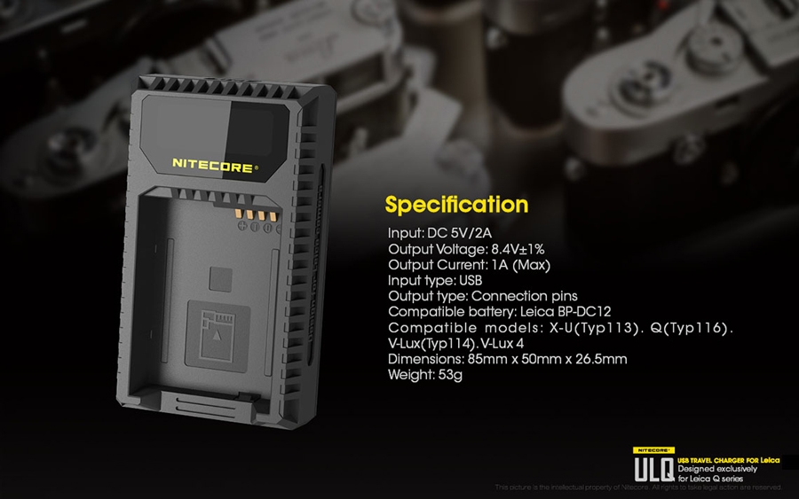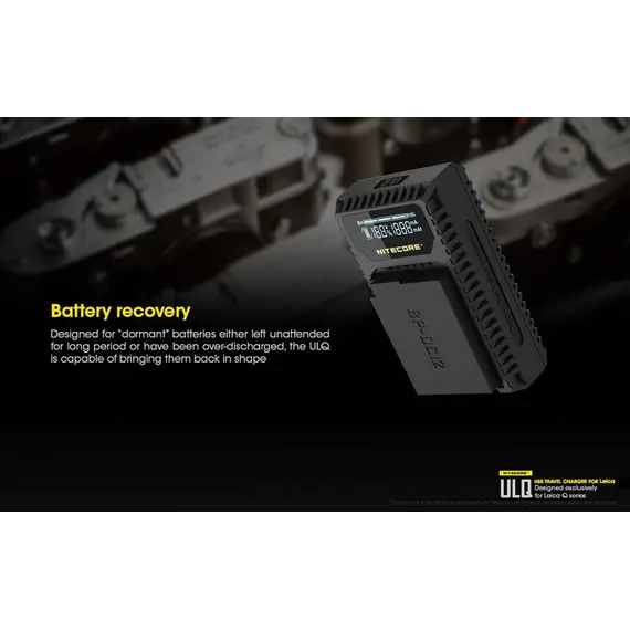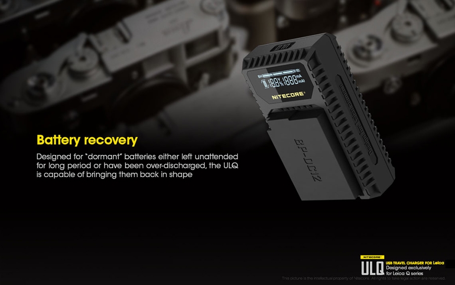 Φορητός φορτιστής ταξιδίου με USB για μπαταρίες φωτογραφικών μηχανών LEICA. Απολαύστε αδιάκοπη παροχή ρεύματος σε εξωτερικούς χώρους. Είναι μία επαγγελματική κατασκευή που ξεπερνά κάθε προσδοκία. Αποτελεί την ιδανική λύση για την φόρτιση σε εξωτερικούς χώρους, σπάζοντας τα τεχνολογικά δεσμά που ήρθαν ως κληρονομιά στα συμβατικά συστήματα φόρτισης των φωτογραφικών μηχανών. Η NITECORE είναι παγκοσμίως γνωστή για την κυρίαρχη θέση της στην αγορά των φορτιστών. Η NITECORE λειτουργεί με πλήρη συμμόρφωση στις κατευθυντήριες γραμμές του ISO9001 με τα πιο απαιτητικά πρότυπα στις γραμμές παραγωγής των εργοστασίων. Τα προϊόντα που πωλούνται με την επωνυμία της NITECORE είναι όλα εγκεκριμένα σύμφωνα με CE, ROHS, FCC, CEC, REACH, KC, C-TICK από έναν διαπιστευμένο φορέα πιστοποίησης εξασφαλίζοντας την παροχή αποτελεσματικής λύσης. Είναι συμβατός με πολλές εξωτερικές πηγές ενέργειας. Εύκολα τα καταφέρνει σε καταστάσεις όπου δεν υπάρχει παροχή ρεύματος AC. Είναι συμβατός με μία ποικιλία φορητών μπαταριών (power bank), ηλιακών panel, Μετασχηματιστών USB καθώς επίσης μπορεί να χρησιμοποιηθεί σε συνδυασμό με τον F1 της NITECORE για ατελείωτη ενέργεια. Σημειώστε ότι με τον F1 και μία πλήρως φορτισμένη μπαταρία 18650 ο ULQ μπορεί να φορτίσει πλήρως 2-3 μπαταρίες φωτογραφικών μηχανών. O ULQ λαμβάνει τα πλεονεκτήματα ενός έξυπνου συστήματος ελέγχου της φόρτισης, ελέγχει τον τύπο της μπαταρίας, την χωρητικότητα, την εσωτερική αντίσταση με το ξεκίνημα της φόρτισης και αυτόματα παρέχει το πιο κατάλληλο ρεύμα φόρτισης βασισμένο στα δεδομένα που ανιχνεύθηκαν. Η οθόνη υγρών κρυστάλλων (LCD) παρέχει πληροφορίες για τα δεδομένα της φόρτισης σε πραγματικό χρόνο. Ο ULM9 έχει την δυνατότητα να ελέγχει την κατάσταση της μπαταρίας. Με την τοποθέτηση της μπαταρίας για φόρτιση ο ULM9 ξεκινά έναν έλεγχο για την υγεία της μπαταρίας βασισμένη στην εσωτερική αντίσταση της. Μία μπάρα "Υγείας" στην οθόνη του φορτιστή χωρισμένη σε τρία τμήματα θα εμφανιστεί. Όταν εισαχθεί μία μπαταρία που το επίπεδο "υγείας" της έχει φτάσει στο χαμηλότερο επίπεδο, η μπάρα "υγείας" που εμφανίζεται στην οθόνη του φορτιστή θα αρχίσει να αναβοσβήνει και η μπαταρία αυτή θα πρέπει να αντικατασταθεί. Ο φορτιστής ULQ διαθέτει λειτουργία ανάκτησης αδρανών μπαταριών. Είτε επειδή μία μπαταρία έχει μείνει σε αχρησία για μεγάλο χρονικό διάστημα είτε γιατί έχει αποφορτιστεί υπερβολικά ο ULQ έχει την ικανότητα να την επαναφέρει σε κατάσταση σωστής λειτουργίας. Προστασία ανάποδης πολικότητας και βραχυκυκλώματος. Ο ULQ διαθέτει ένα μηχανικό σύστημα προστασίας από ανάποδη πολικότητα που αποτρέπει να ξεκινήσει η φόρτιση εάν έχει τοποθετηθεί ΜΗ-συμβατή ή Λάθος τοποθετημένη μπαταρία. Το μήνυμα λάθους "EE" θα εμφανιστεί στην οθόνη εάν μία βραχυκυκλωμένη μπαταρία εισαχθεί για φόρτιση. Είναι κατασκευασμένος από PC+ABS ανθεκτικό υλικό, επιβραδυντικό της φωτιάς. Οι διαστάσεις του είναι μικρές για να είναι βολικός στην μεταφορά. Στο πίσω μέρος του υπάρχει χώρος για την αποθήκευση του καλωδίου USB.