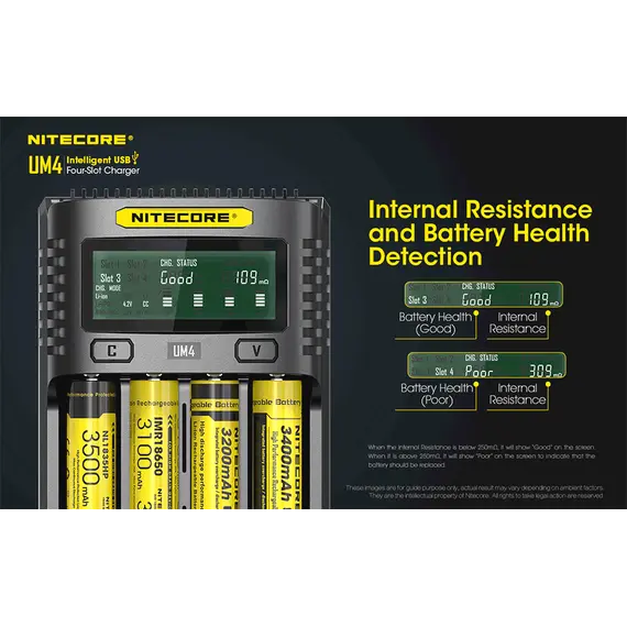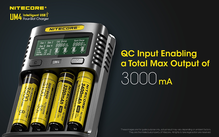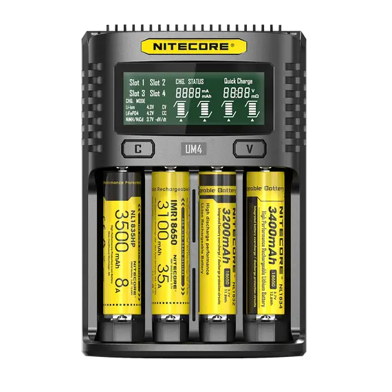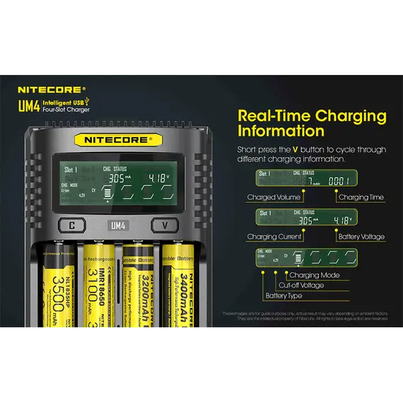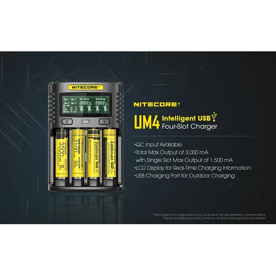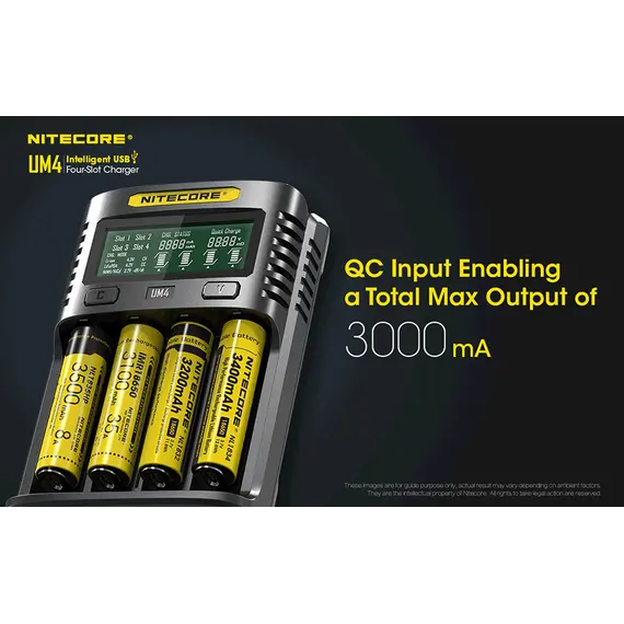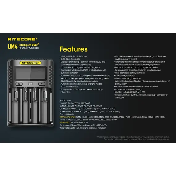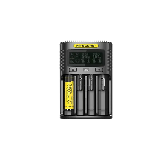 Ένας έξυπνος φορτιστής τεσσάρων θέσεων με δυνατότητα γρήγορης φόρτισης (QC) , συνολικό μέγιστο ρεύμα φόρτισης τα 3000mA (QC) και μέγιστο ρεύμα φόρτισης σε μία μόνο θέση που μπορεί να φθάσει τα 1500mA Ψηφιακή οθόνη υγρών κρυστάλλων (LCD) για παρουσίαση σε πραγματικό χρόνο πληροφοριών της φόρτισης. Φόρτιση από θύρα USB, τον καθιστά ιδανικό φορτιστή για εξωτερικές δραστηριότητες. Διαθέτει ένα βελτιωμένο πρόγραμμα φόρτισης για μπαταρίας IMR. Ανιχνεύει την εσωτερική αντίσταση και την υγεία της μπαταρίας. Eπιλέγει αυτόματα ανάμεσα σε τρία προγράμματα (CC, CV and -dV / dt) σύμφωνα με τον τύπο και την χωρητικότητα των μπαταριών. Οι παράμετροι φόρτισης μπορούν να ρυθμιστούν χειροκίνητα για να ικανοποιήσουν διαφορετικές ανάγκες. Είναι συμβατός με διάφορες εξωτερικές πηγές ενέργειας όπως USB αντάπτορες, Power Banks, Solar Panels κλπ Έχει την δυνατότητα να αποκαταστήσει υπερ-αποφορτισμένες μπαταρίες IMR . Έχει την δυνατότητα να ενεργοποιήσει υπερ-αποφορτισμένες μπαταρίες ιόντων λιθίου Li-ion. Θα ελέγξει και θα ενεργοποιήσει πριν ξεκινήσει την φόρτιση. Εάν η μπαταρία είναι κατεστραμμένη στην οθόνη θα εμφανιστεί το μήνυμα "ΕΕ ΕΕ". Διαθέτει προστασία ανάποδης πολικότητας και βραχυκυκλώματος. Εάν δεν υπάρξει καμία ενέργεια στα κομβία του φορτιστή μέσα σε 10 λεπτά, η οθόνη θα σβήσει για να εξοικονομήσει ενέργεια. Είναι κατασκευασμένος από ανθεκτικά πολυκαρβονικά υλικά, επιβραδυντικά της φωτιάς. Ενσωματώνει έξυπνο σύστημα ρύθμισης της θερμοκρασίας που είναι σχεδιασμένο να τον προστατεύει από υπερθέρμανση. Τα μοναδικά πτερύγια ψύξης έχουν σχεδιαστεί για εξαιρετική απόδοση ψύξης