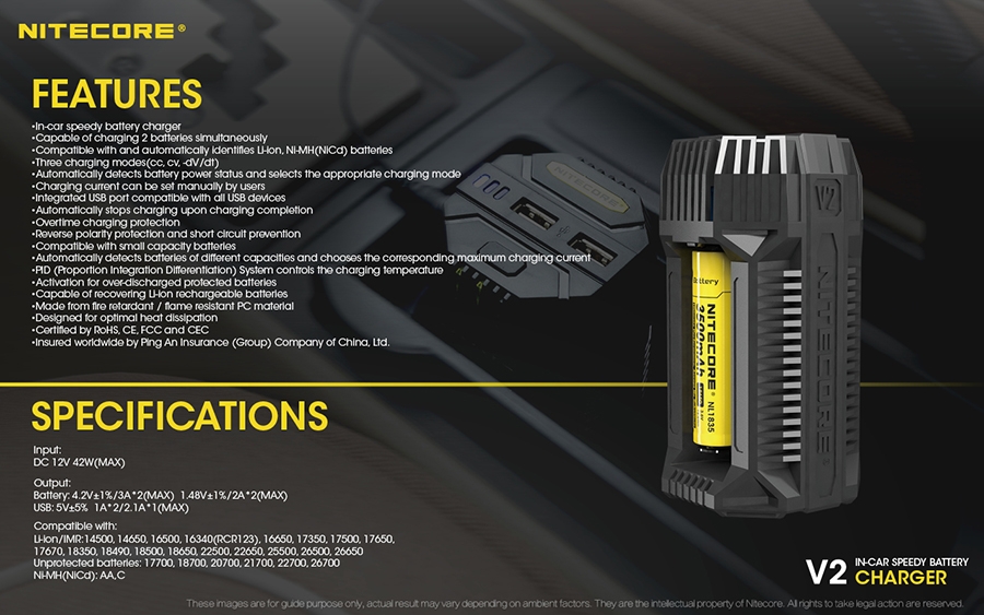 Μόλις 40 λεπτά είναι αρκετά για να γεμίσουν μία μπαταρία IMR18650 έως το 80% της χωρητικότητας της. Ο καινοτόμος σχεδιασμός του που μοιάζει με κύπελο του καφέ, του επιτρέπει να χωρά και να στέκεται με ασφάλεια στις ειδικές θήκες των αυτοκινήτων. Διαθέτει δύο θύρες USB με ισχύ εξόδου 2,1Α σε κάθε μία για την επαρκή τροφοδοσία / φόρτιση smartphones, tablet ή άλλων συσκευών. Η λειτουργία του φορτιστή ελέγχεται από έναν διακόπτη. Είναι εύκολη γρήγορη και ασφαλής. Ενδεικτικές λυχνίες ενημερώνουν για την κατάσταση φόρτισης και το ρεύμα φόρτισης. Με το ενσωματωμένο κύκλωμα ελεγχόμενο από μικροεπεξεργαστή, ο φορτιστής λειτουργεί αυτόματα & έξυπνα αναγνωρίζοντας το τύπο της μπαταρίας και επιλέγοντας το κατάλληλο μοντέλο φόρτισης. Φορτίζει εξίσου καλά, με ειδικό ενσωματωμένο πρόγραμμα (-dV/dt) και μπαταρίες Ni-MH/Ni-CD. Τα πτερύγια / ψήκτρες στο επάνω μέρος της συσκευής διαχέουν την θερμότητα ικανοποιητικά. Στην συσκευασία περιλαμβάνεται και καλώδιο σύνδεσης με αναπτήρα αυτοκινήτου 12V. Ο φορτιστής είναι ικανός να ενεργοποιήσει εξαντλημένες μπαταρίες. Τα υλικά κατασκευής του είναι ανθεκτικά και επιβραδυντικά στην φωτιά
