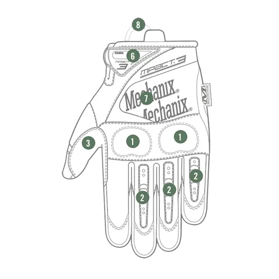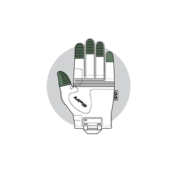 Τα M-Pact® 3 διαθέτουν εσωτερική ενίσχυση στην άκρη των δαχτύλων για ακραία αντοχή στην τριβή και ανάγλυφη σχηματομορφή για πρόσθετη πρόσφυση όταν την χρειάζεστε. Η κατασκευή της παλάμης δύο περιοχών ενισχύει τις περιοχές υψηλής φθοράς και μειώνει το "μάζεμα" του υφάσματος κατά την χρήση των όπλων ή των εργαλείων.