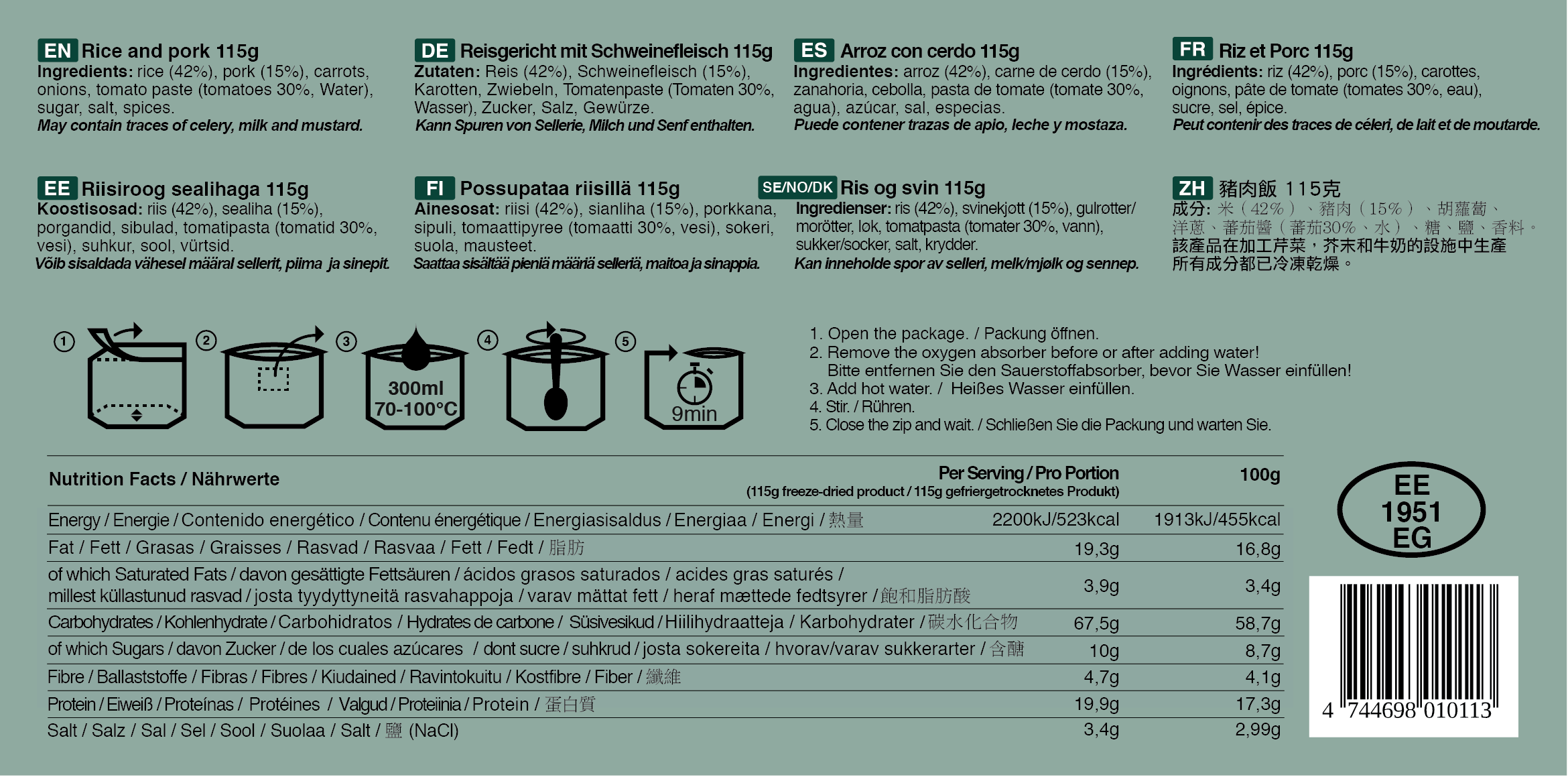 Με πολύ χαμηλό βάρος και υψηλή θερμιδική αξία, τα γεύματα αυτά προσφέρουν εξαιρετική ποιότητα γεύσης και ευνοούν την πέψη. Δεν περιέχουν συντηρητικά ή ενισχυτικά γεύσης χάρη στην προηγμένη τεχνολογία freeze dried, που διατηρεί τη θρεπτική αξία και την αυθεντικότητα των συστατικών.