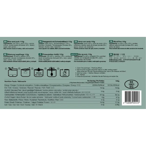 Η συσκευασία είναι ανθεκτική και προστατευμένη, σχεδιασμένη έτσι ώστε να μπορεί να χρησιμοποιηθεί για την προετοιμασία του γεύματος μέσα σε αυτήν. Με ελάχιστο βάρος και μικρό όγκο, χωρά εύκολα σε σακίδιο ή ακόμα και σε θήκες ρουχισμού, χωρίς να επιβαρύνει τον χρήστη.