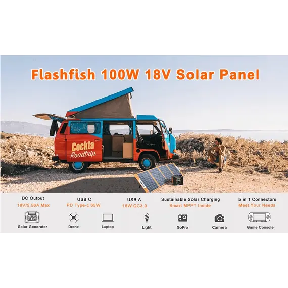 To φορητό Ηλιακό Πάνελ 100 Watt FlashFish είναι κατασκευασμένο απο μονοκρυσταλικό πυρίτιο, με αποτέλεσμα να παράγει ενέργεια ακόμα και τις μέρες με συννεφιά. Το πάνελ είναι ιδανικό για να φορτίσει τις Power Station FlashFish E200 και FlashFish A301.