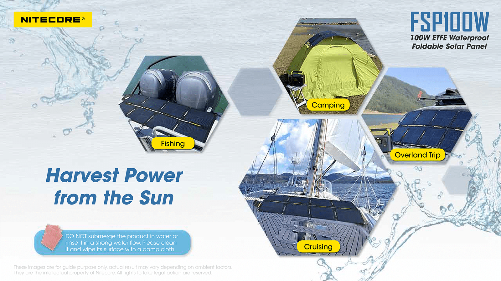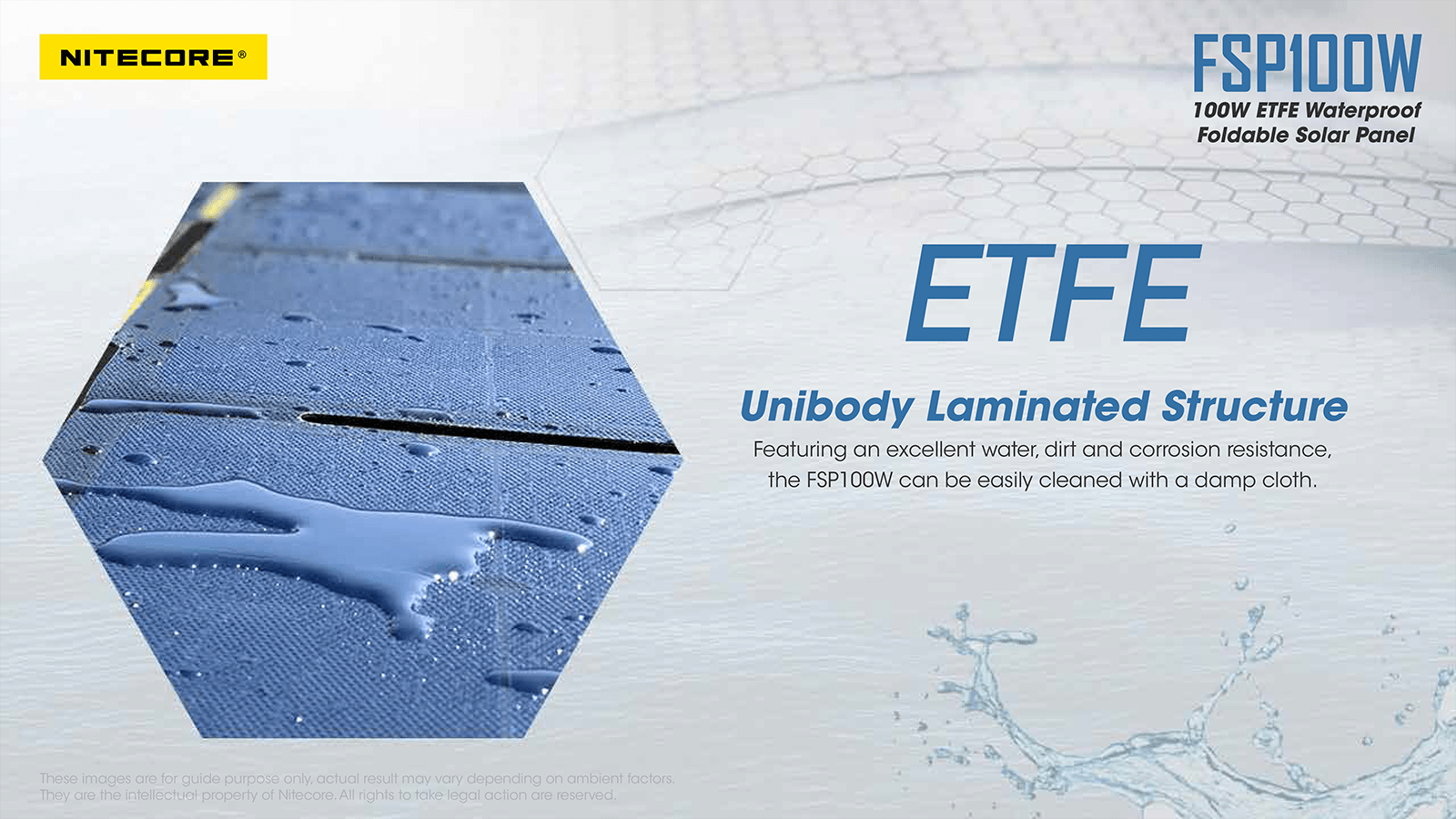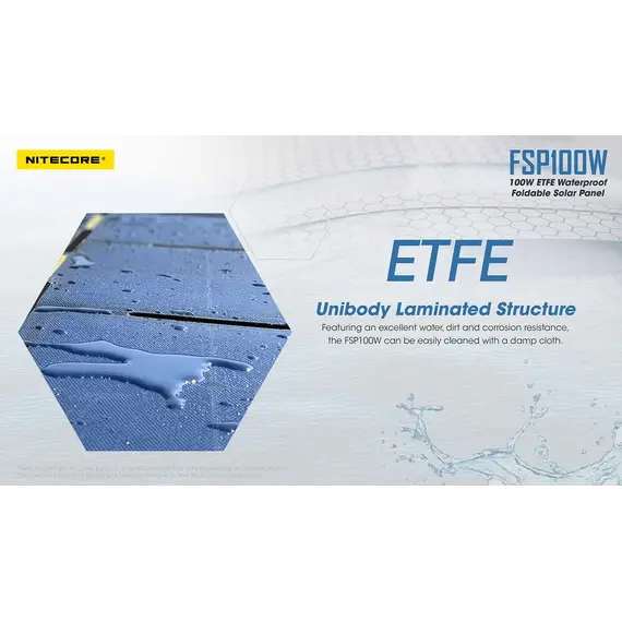 ΗΛΙΑΚΟ PANEL NITECORE FSP100W, Φορητό, 100W, Αδιάβροχο 01. Αναδιπλούμενο αδιάβροχο ηλιακό panel 100W κατασκευασμένο από EFTE (Το αιθυλένιο τετραφθοροαιθυλένιο (ETFE) είναι ένα πλαστικό με βάση φθόριο. Σχεδιάστηκε για να έχει υψηλή αντοχή στη διάβρωση και αντοχή σε μεγάλο εύρος θερμοκρασιών.) Βαθμολογία αδιαβροχότητας IPX5, Συνολικό βάρος: 2,6 κιλά 02. Είναι ο σύντροφος σας στις εξωτερικές δραστηριότητες κοντά στο νερό. Δεν φοβάται την βροχή, το θαλασσινό νερό και γενικά το περιβάλλον με υψηλό ποσοστό υγρασίας. 03. Συλλέγει την ενέργεια από τον Ήλιο ! κατά την διάρκεια του ψαρέματος, στο κάμπινγκ, στην ιστιοπλοϊκά, στα μεγάλα οδικά ταξίδια κ.α. Προσοχή! Μην βυθίζεται το Ηλιακό panel στο νερό ούτε να το ξεπλένετε σε δυνατό τρεχούμενο νερό. Παρακαλούμε καθαρίστε την επιφάνεια του και σκουπίστε την με ένα υγρό πανί. 04. Πολυστρωματική ενιαία κατασκευή που την χαρακτηρίζει η εξαιρετική αντοχή στο νερό, την σκόνη κα την διάβρωση. Μπορεί άνετα να καθαριστεί με ένα υγρό πανί. 05. Εξαιρετική απόδοση των κυψελών που φθάνει το 23% . (Τα κοινά ηλιακά panel έχουν απόδοση που φθάνει το 15%) Στο σύνολο του το FSP100W είναι κατά 60% αποδοτικότερο σε σύγκριση με τα κοινά ηλιακά panel. Μπορεί επίσης να πετύχει σταθερή εναλλαγή ενέργειας ακόμη και σε συννεφιασμένη ημέρα. 06. Γρήγορη φόρτιση με το FSP100W Όταν η Ηλιοφάνεια είναι ικανοποιητική, το FSP100W προσφέρει σταθερή και απεριόριστη παροχή ενέργειας στο εξωτερικό περιβάλλον σε συνδυασμό με ένα φορητό NITECORE Power Station της σειράς NPS 07. Βελτιωμένη φορητότητα . Με βάρος μόλις 2,6 κιλά το FSP100w μπορεί εύκολα να διπλωθεί σε ένα μικρό μέγεθος παρόμοιο με αυτό ενός φορητού υπολογιστή, ιδανικό για μεταφορά με το ένα χέρι και εύκολη αποθήκευση. 08. Ο συνδυασμός του FSP100w με ένα NITECORE Power Station παρέχει αδιάκοπη ενέργεια στις εξωτερικές σας δραστηριότητες. Το Power Station και τα καλώδια σύνδεσης πωλούνται ξεχωριστά από το FSP100w. 09. Είναι ένα απαραίτητο προϊόν για τις εξωτερικές σας δραστηριότητες