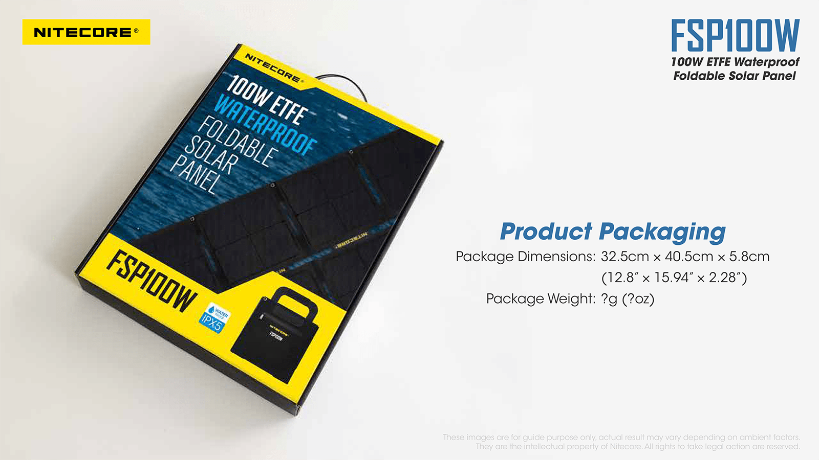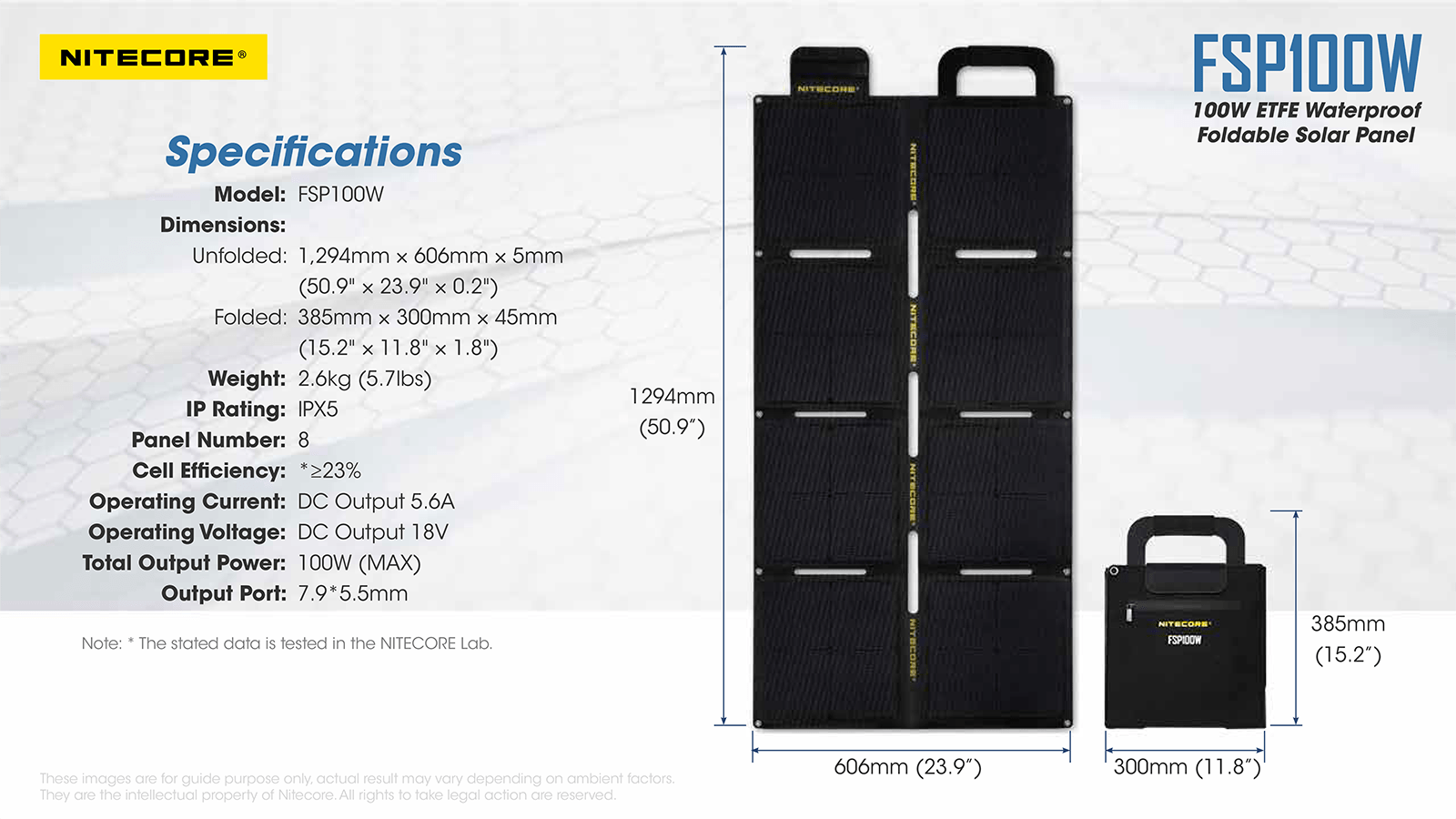 10. Χαρακτηριστικά Μοντέλο: FSP100W Διαστάσεις: Ανοιχτό: 1,294 mm x 606 mm x 5 mm Διπλωμένο: 385 mm x 300 mm x 45 mm Βάρος: 2,6 κιλά Βαθμός αδιαβροχότητας: IPX5 Αριθμός panels: 8 Αποδοτικότητα κυψελών : >23% Ρεύμα λειτουργίας: Έξοδος DC ρεύματος 5,6A Τάση λειτουργίας: Έξοδος DC ρεύματος 18V Συνολική ενέργεια εξόδου: 100 Watt (Μέγιστη) Θύρα εξόδου: 7,9 mm x 5,5 mm 11. Έγχρωμη συσκευασία