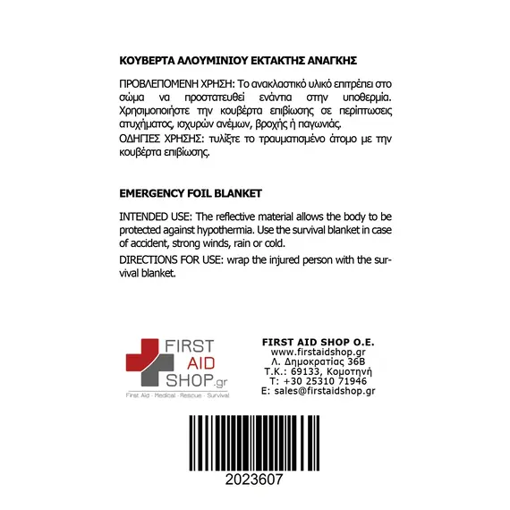 Η κουβέρτα διατίθεται σε διαφανή συσκευασία zip νάιλον, εξαιρετικά ελαφριά και συμπαγής, καθιστώντας τη ιδανική για μεταφορά. Χωρά εύκολα σε κιτ επιβίωσης ή σε φαρμακεία Α' Βοηθειών όπως αυτά του FirstAidShop.