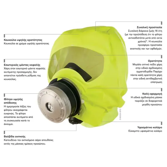 - Πιστοποιήσεις: σύμφωνα με EN 403:2004 για κουκούλες διαφυγής πυρκαγιάς, επιπρόσθετα έχει δοκιμαστεί για χρήση ενάντια στο H2S (στα 2,500 ppm) σύμφωνα με το DIN 58647-7