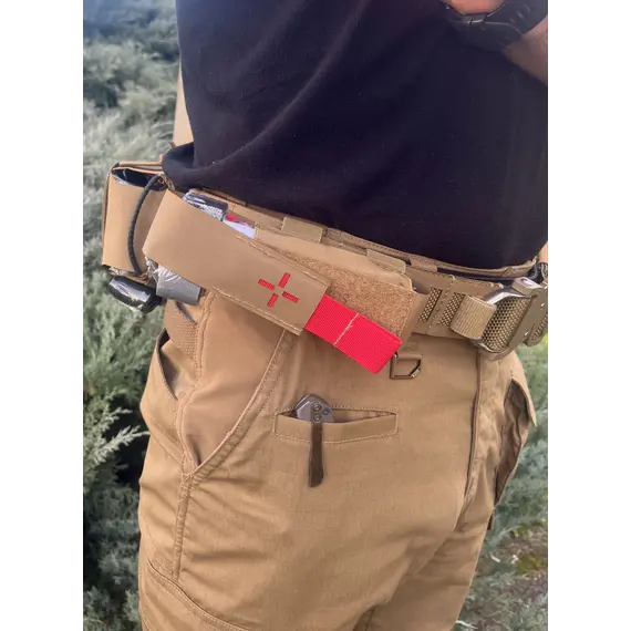 Μπορεί να τοποθετηθεί τόσο κάθετα (PALS/MOLLE) όσο και οριζόντια (One Wrap), προσφέροντας ευελιξία προσαρμογής σε διάφορους τύπους εξοπλισμού. Τα πλευρικά ελαστικά μέρη εξασφαλίζουν σταθερή εφαρμογή, ενώ ο κόκκινος ιμάντας επιτρέπει την ταχεία και ελεγχόμενη εξαγωγή του tourniquet χωρίς τον κίνδυνο να πέσει στο έδαφος. Με το τράβηγμα αυτού του ιμάντα, αυτόματα το TQ εξέρχεται χωρίς να πέφτει τόσο όσο να μπορεί να το αρπάξει ο χρήστης και να το πάρει στο χέρι του σε ελάχιστο χρόνο. Η κίνηση αυτή μπορεί να υλοποιηθεί και με το ένα οποιοδήποτε χέρι (αριστερό ή δεξί), σε περίπτωση που λόγω τραυματισμού ή άλλου λόγου δεν υπάρχει δυνατότητα χρήσης του άλλου χεριού.