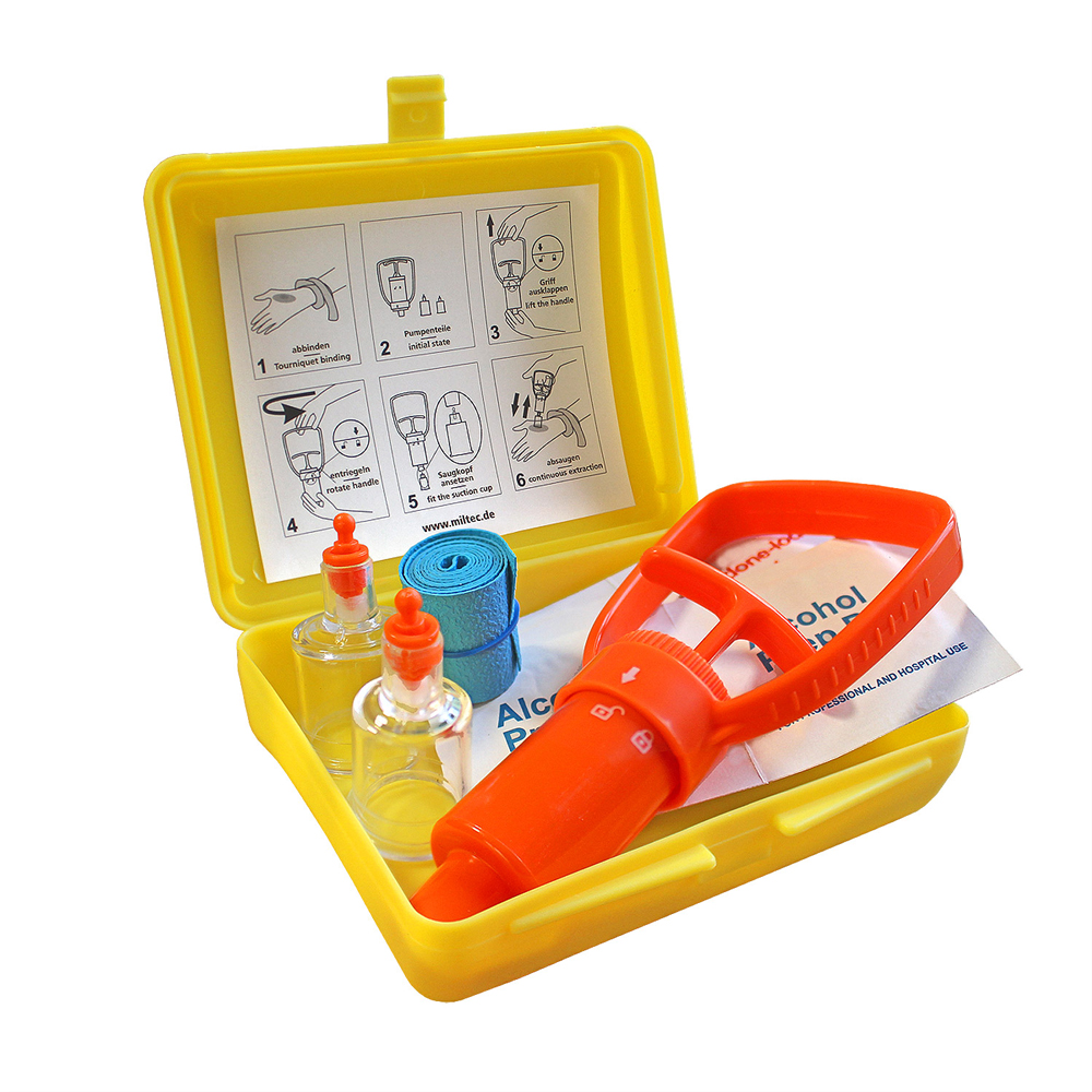 Το κιτ περιλαμβάνει μια αντλία αναρρόφησης που βοηθά στην απομάκρυνση του δηλητηρίου από την περιοχή του τραύματος, προσφέροντας άμεση ανακούφιση και κερδίζοντας πολύτιμο χρόνο μέχρι την παροχή ιατρικής φροντίδας. Συνοδεύεται από βεντούζες διαφορετικών μεγεθών για χρήση σε διάφορα σημεία του σώματος, καθώς και από βοηθητικά αξεσουάρ για την απολύμανση και την αιμόσταση.