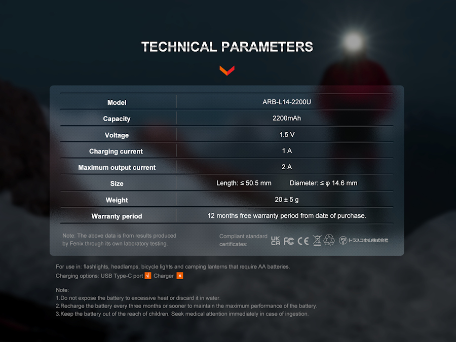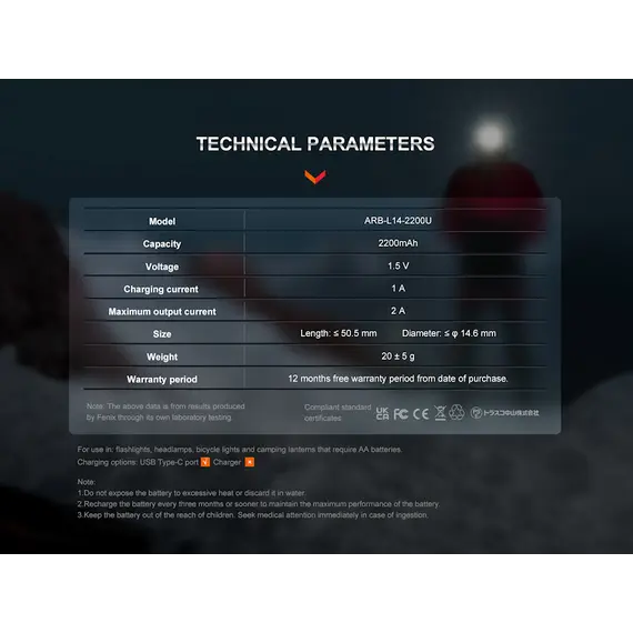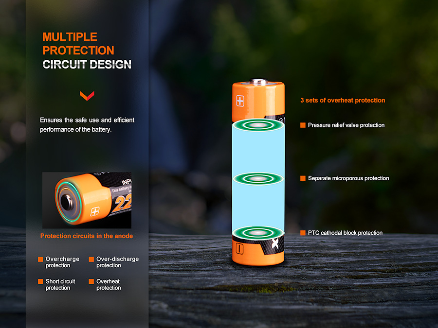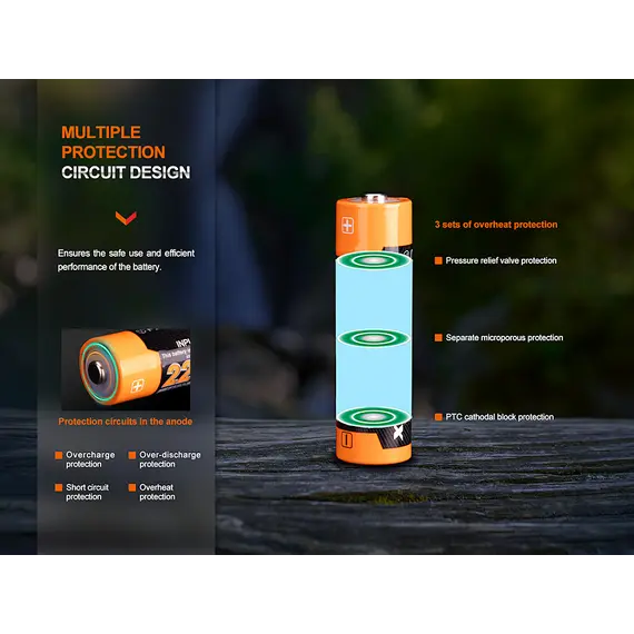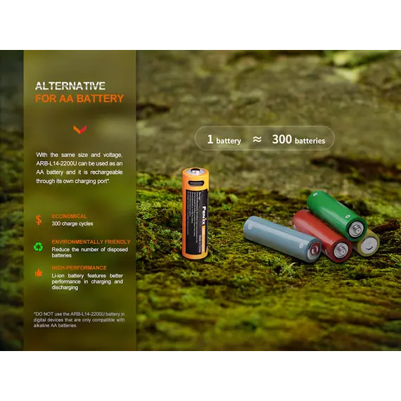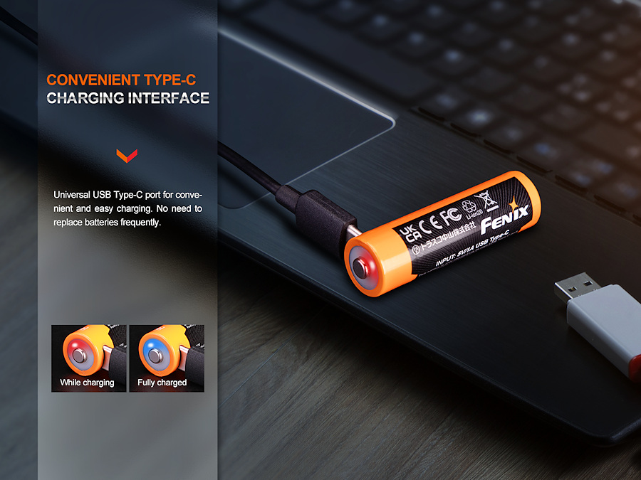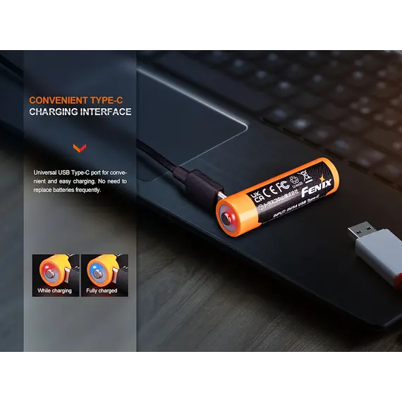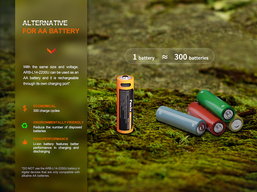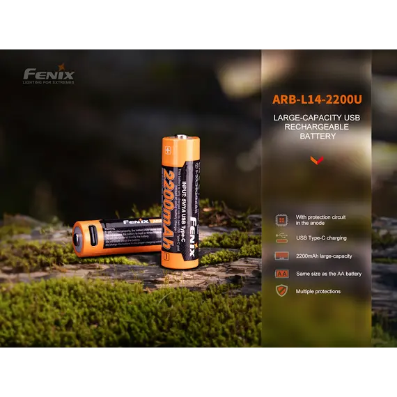 Μπαταρία Fenix ARB-L14-2200U Επαναφορτιζόμενη USB 2200mAh Η επαναφορτιζόμενη μπαταρία Fenix ARB-L14-2200U είναι μια μπαταρία με σύσταση ιόντων λιθίου Li-ion και διαθέτει κύκλωμα προστασίας που βοηθά στην αποφυγή βραχυκυκλωμάτων και υπερθέρμανσης. Ακόμα η συγκεκριμένη μπαταρία Fenix διαθέτει ενσωματωμένη θύρα φόρτισης USB Type-C για γρήγορη και εύκολη φόρτιση χωρίς την ανάγκη εξωτερικού φορτιστή. Τέλος περιλαμβάνει πολλαπλά επίπεδα προστασίας, τα οποία διασφαλίζουν τον σωστό αερισμό της μπαταρίας, αποτρέποντας έτσι ακόμα και την σπάνια περίπτωση εσωτερικού βραχυκυκλώματος.