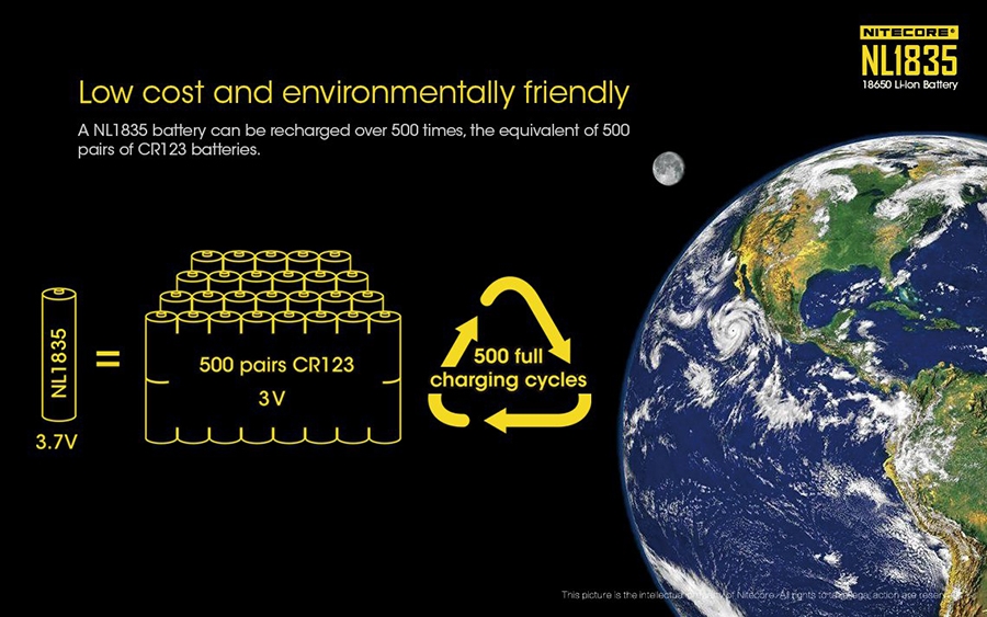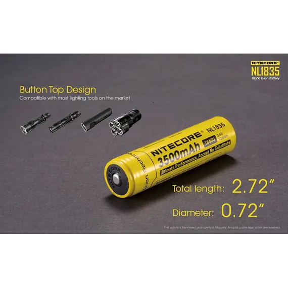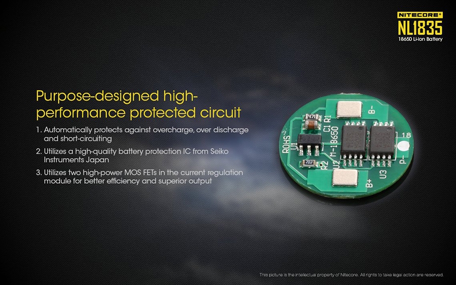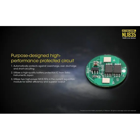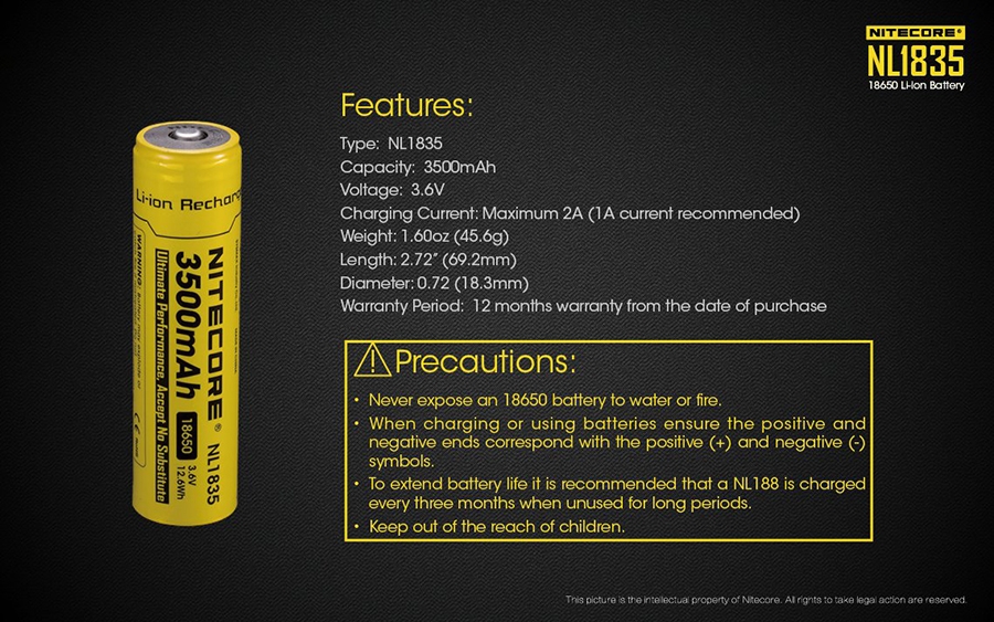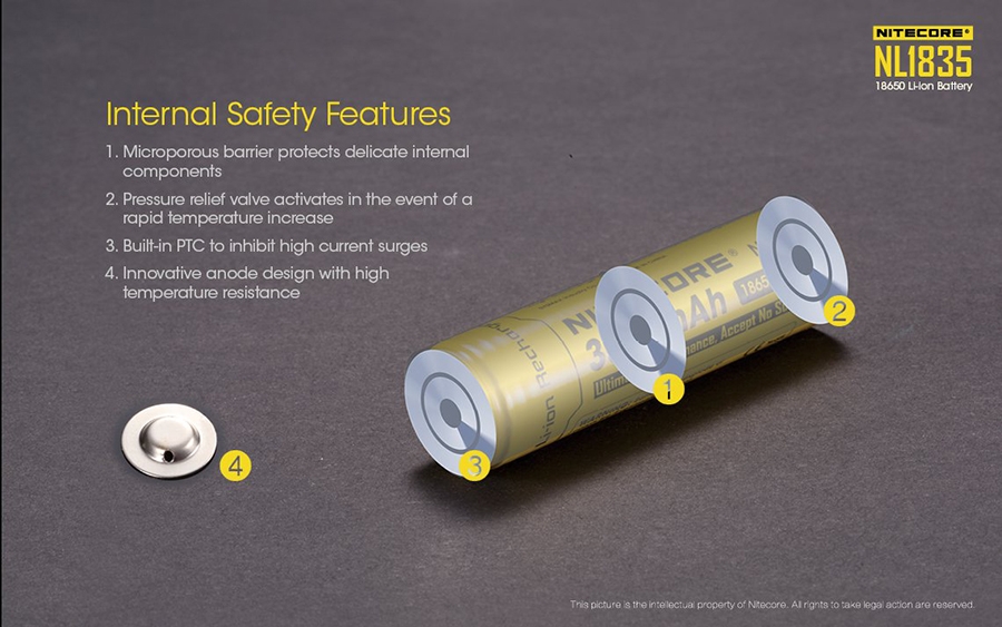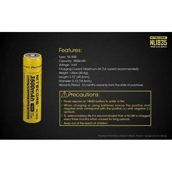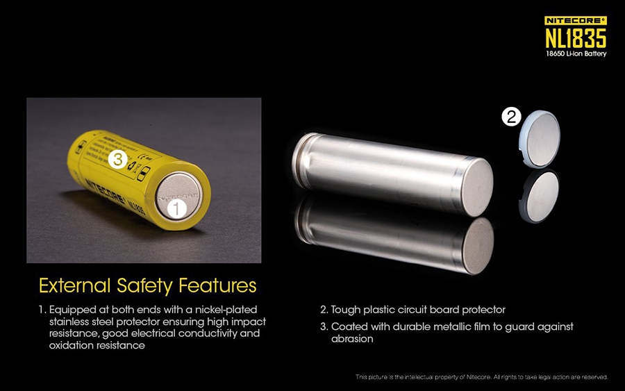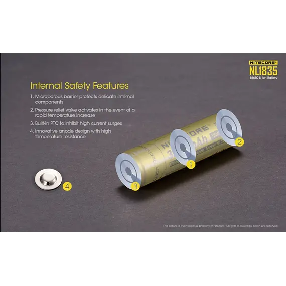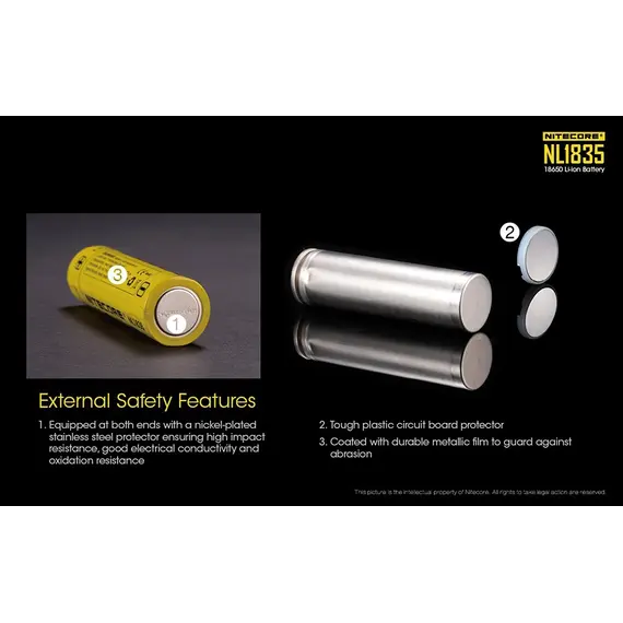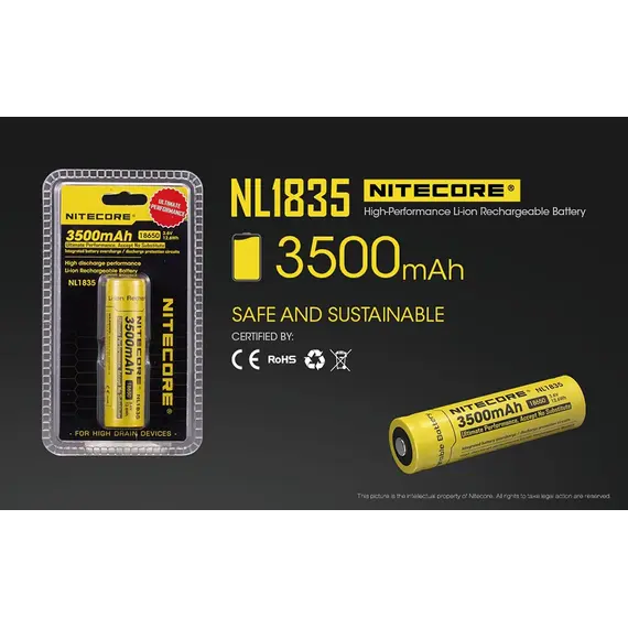 Υψηλής απόδοσης επαναφορτιζόμενη μπαταρία Li-ion με χωρητικότητα 3500mAh. Ασφαλής και με διάρκεια. Πιστοποιημένη από RoHS & CE. Μικρο-πορώδη φράγματα προστατεύουν τα ευαίσθητα εσωτερικά εξαρτήματα. Βαλβίδα εκτόνωσης της πίεσης ενεργοποιείται σε απότομη αύξηση της θερμοκρασίας. Προστατευτικά στους πόλους από επινικελώμένο ανοξείδωτο ατσάλι προστατεύουν από ισχυρά χτυπήματα, εξασφαλίζουν πολύ καλή αγωγιμότητα και προστατεύουν από την οξείδωση. Προστατευτικό της πλακέτας κυκλώματος από σκληρό πλαστικό. Ειδικά σχεδιασμένο κύκλωμα προστασίας υψηλής απόδοσης, προστατεύει από υπέρφόρτιση, υπερ-αποφόρτιση και βραχυκύκλωμα. Συμβατή με τους περισσότερους φακούς της αγοράς. Συνοδεύεται από Ασφάλεια παγκοσμίου επιπέδου. Συμβατή με όλους τους έξυπνους φορτιστές της NITECORE.