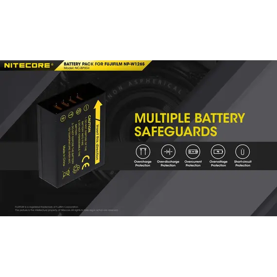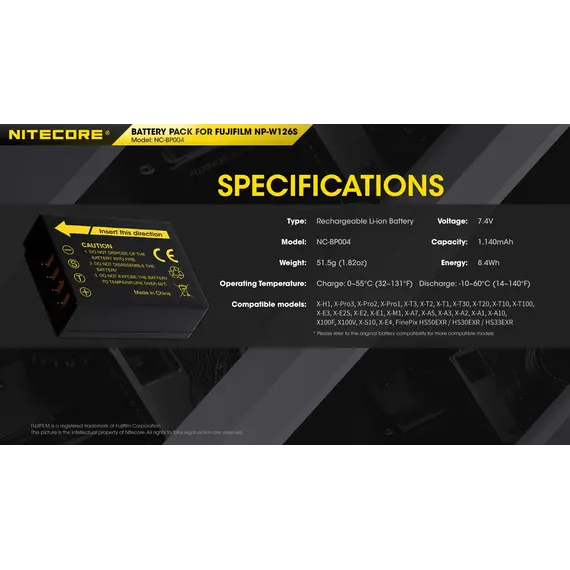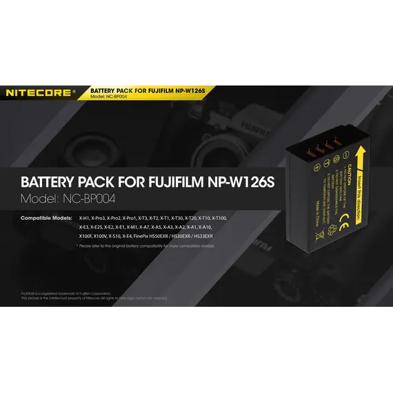 ΜΠΑΤΑΡΙΑ NITECORE for Fujifilm NP-W126S, 7.2V , 1140mAh, 8.4Wh Επαναφορτιζόμενη μπαταρία για φωτογραφικές μηχανές FUJIFILM NP-W126S Συμβατή με τα μοντέλα : X-H1, X-Pro3, X-Pro2, X-Pro1, X-T3, X-T2, X-T1, X-T30, X-T20, X-T10, X-T100 X-E3, X-E2S, X-E2, X-E1, X-M1, X-A7, X-A5, X-A3, X-A2, X-A1, X-A10, X100F, X100V, X-S10, X-E4, FinePix HS50EXR / HS30EXR / HS33EXR Μεγάλη χωρητικότητα 1140 mAh, επιτρέπει την λήξη περισσότερων φωτογραφιών . Διαθέτει πολλές ασφαλιστικές δικλίδες Προστασία υπερβολικής φόρτισης, Προστασία υπερβολικής αποφόρτισης, Προστασία υπερβολικού ρεύματος, Προστασία υπερβολικής τάσης, Προστασία βραχυκυκλώματος . Ακριβές μέγεθος Ταιριάζει απόλυτα στις θέσεις των μπαταριών Fujifilm Τεχνικά χαρακτηριστικά Τύπος:         Επαναφορτιζόμενη μπαταρία Li-ion Μοντέλο:      NC-BP004 Βάρος:         51,5g Τάση:           7,4V Χωρητικότητα:  1140 mAh Ενέργεια:      8,4Wh Εύρος θερμοκρασιών λειτουργίας:   Φόρτιση 0 ~ 55 C° Αποφόρτιση  -10 C° ~ 60 C° Συμβατά μοντέλα: X-H1, X-Pro3, X-Pro2, X-Pro1, X-T3, X-T2, X-T1, X-T30, X-T20, X-T10, X-T100 X-E3, X-E2S, X-E2, X-E1, X-M1, X-A7, X-A5, X-A3, X-A2, X-A1, X-A10, X100F, X100V, X-S10, X-E4, FinePix HS50EXR / HS30EXR / HS33EXR