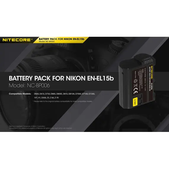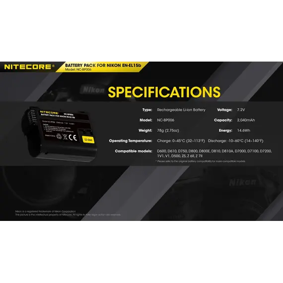 ΜΠΑΤΑΡΙΑ NITECORE for Nikon EN-EL15b, 7.2V , 2040mAh, 14.6Wh