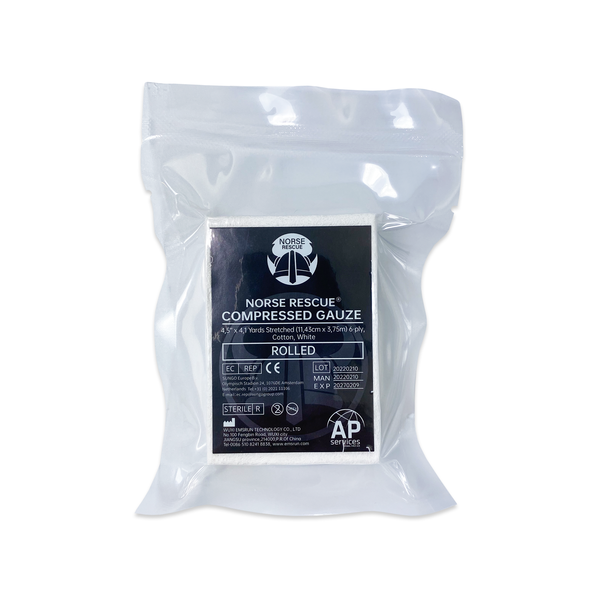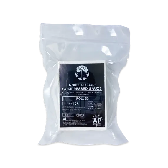 Η NORSE RESCUE Compressed Gauze είναι μία υψηλής ποιότητας αιμοστατική γάζα εμποτισμού τύπου, τυλιγμένη με τη μέθοδο Rolled, κατασκευασμένη από 100% βαμβάκι. Χάρη στην εξαιρετική απορροφητικότητα της, προσφέρει αποτελεσματική απορρόφηση υγρών και αίματος σε κρίσιμες στιγμές.