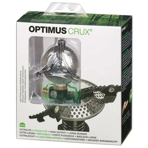 Πατήστε εδώ για να δείτε τα φιαλίδια γκαζιού). Το μεγάλο πλεονέκτημα των βιδωτών φιαλιδίων είναι ότι μπορεί να αφαιρεθούν χωρίς να έχουν αδειάσει και να επανατοποθετηθούν όταν χρειαστεί. Αυτό κάνει τη μεταφορά τους πολύ πιο εύκολη και ασφαλή. Η ανάφλεξη της εστίας είναι χειροκίνητη. Η Optimus Crux συνοδεύεται από θήκη μεταφοράς.