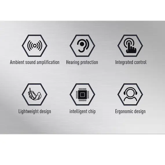 Εξοπλισμένες με ένα ενσωματωμένο τσιπ που χρησιμοποιεί προηγμένη τεχνολογία επεξεργασίας ψηφιακού σήματος, μειώνουν αποτελεσματικά τον ένταση του ήχου σε θορυβώδη περιβάλλοντα και ελαχιστοποιούν τη ζημιά που προκαλείται στην ακοή από τον ήχο των πυροβολισμών .