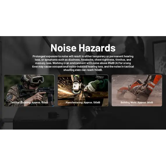 Η παρατεταμένη έκθεση σε θόρυβο θα έχει ως αποτέλεσμα είτε προσωρινή είτε μόνιμη απώλεια ακοής, ή συμπτώματα όπως ζάλη, πονοκέφαλο, σφίξιμο στο στήθος, εμβοές και απώλεια μνήμης. Η εργασία σε περιβάλλον με θόρυβο άνω των 85dB (A) για μεγάλο χρονικό διάστημα μπορεί να προκαλέσει εργασιακή απώλεια ακοής λόγω θορύβου, ενώ ο θόρυβος σε επιχειρησιακή σκοποβολή μπορεί να φτάσει ακόμη και τα 150dB.