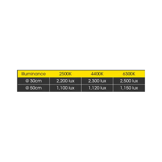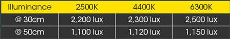 6300Κ: 2,500 Lux στα 30cm // 1,150 Lux στα 50cm