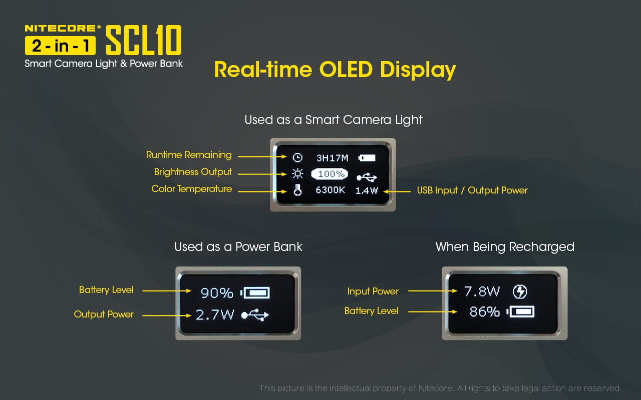 - Οθόνη OLED πραγματικού χρόνου για ενημέρωση για τον χρόνο λειτουργίας, την ένταση της φωτεινότητας, την θερμοκρασία του χρώματος φωτισμού κ.α.