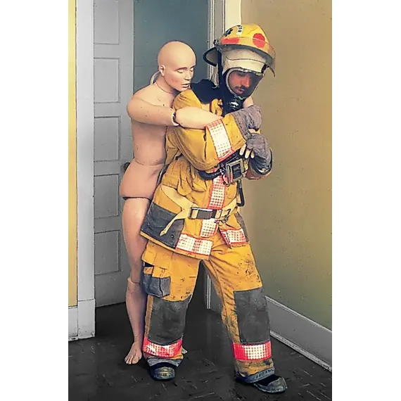 uncomfortable for human volunteers and especially suitable for Military, Fire Departments, Police Departments, Safety Teams and Emergency Personnel. The manikin features articulated joints and realistic weight distribution. It is made of durable plastic with strong plastic-coated cables. This manikin is not fire resistant and is not for water rescue.