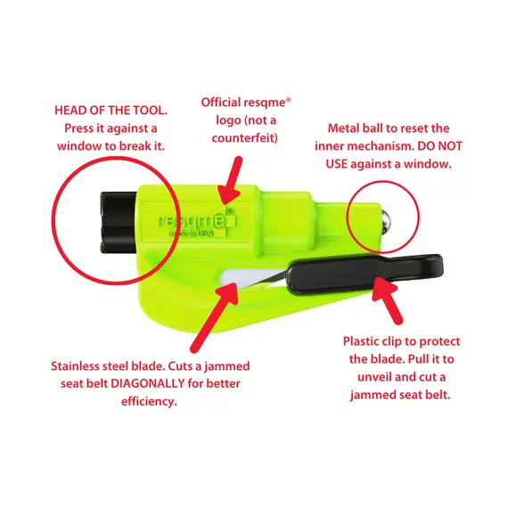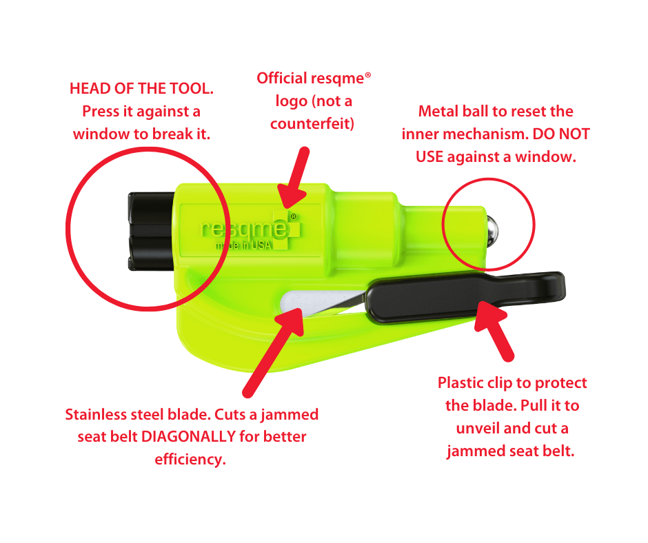 Το resqme μπορεί να κόψει μπλοκαρισμένες ζώνες ασφαλείας με την κοφτερή του λεπίδα και να σπάσει τα πλαϊνά τζάμια με την ακίδα του. Το RESQME είναι ένα εργαλείο που πρέπει να έχει ο κάθε οδηγός. Είναι ελαφρύ, μικρό αλλά πολύ χρήσιμο. Μπορείτε να το έχετε στα κλειδιά σας ή να το προσαρμόσετε σε κάποιο σημείο του αυτοκινήτου σας έτσι ώστε να είναι πάντα προσβάσιμο σε καταστάσεις έκτακτης ανάγκης.