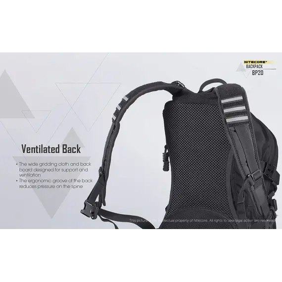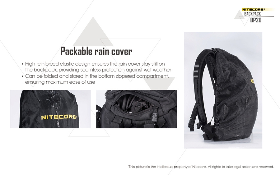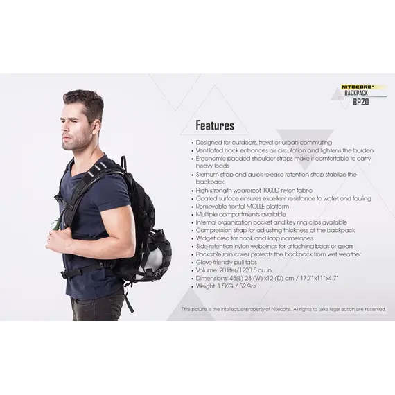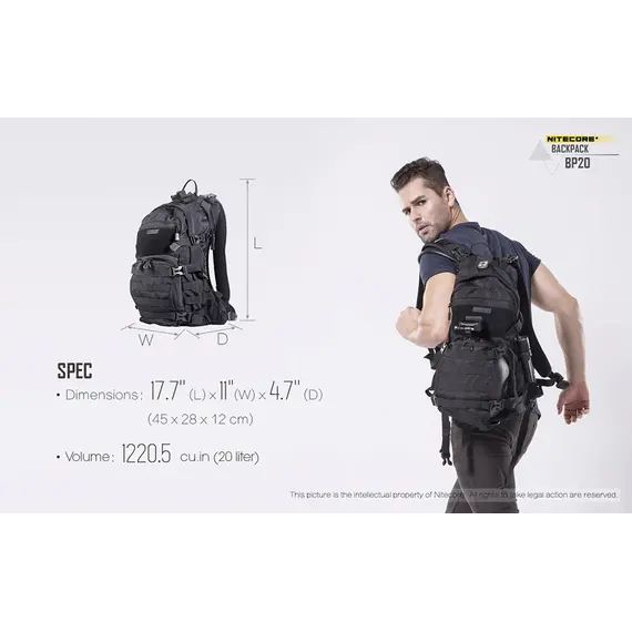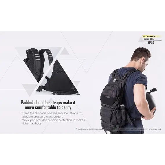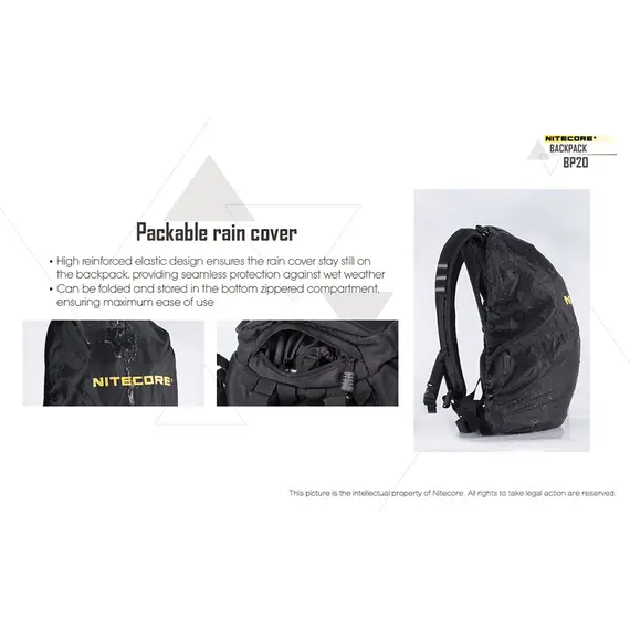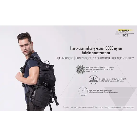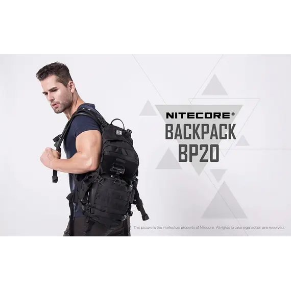 Ο σάκος BP20, της εταιρείας Nitecore, είναι ένας ανθεκτικός και μεγάλης χωρητικότητας σάκος πλάτης σχεδιασμένος να είναι τόσο άνετος όσο και ανθεκτικός για την κάθε δραστηριότητα του χρήστη. Κατασκευασμένος από ανθεκτικό σε χρήση, στρατιωτικού τύπου νάιλον 1000D, ο σάκος BP20 παρέχει εξαιρετική αντοχή σε φθορά και σκισίματα, νερό και λεκέδες. Επιπρόσθετα το ενσωματωμένο κάλυμμα βροχής εξασφαλίζει ασφάλεια και προστασία του εξοπλισμού από διάφορες καιρικές συνθήκες.