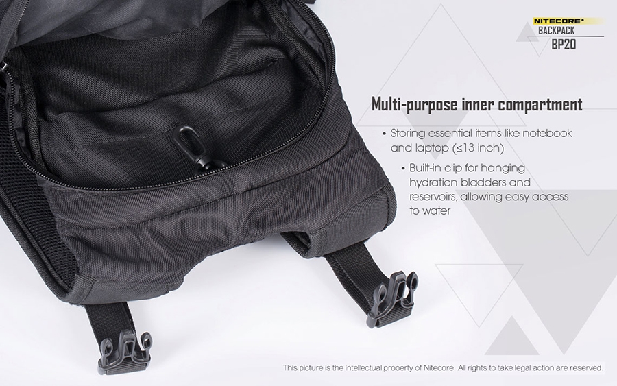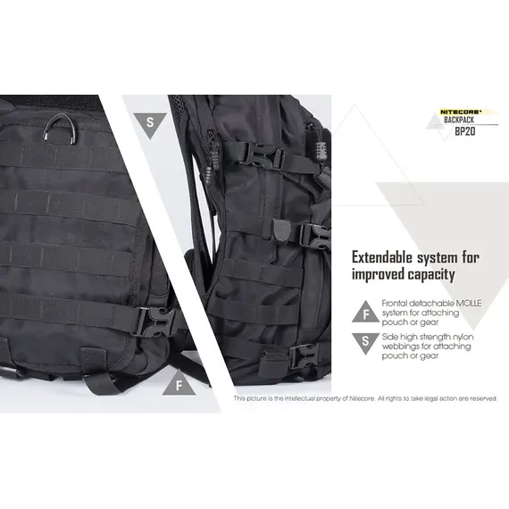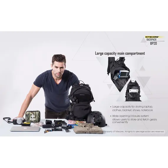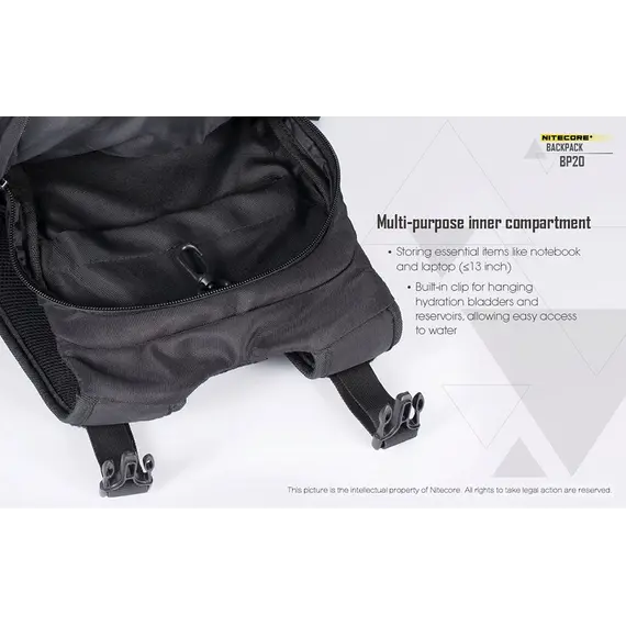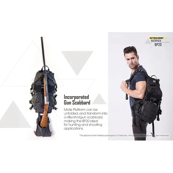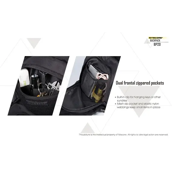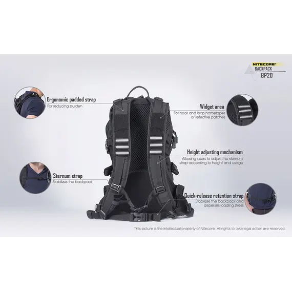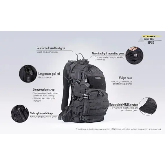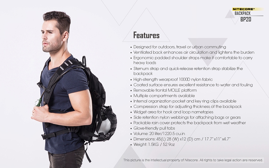 Ο σάκος BP20, της εταιρείας Nitecore, είναι ένας ανθεκτικός και μεγάλης χωρητικότητας σάκος πλάτης σχεδιασμένος να είναι τόσο άνετος όσο και ανθεκτικός για την κάθε δραστηριότητα του χρήστη. Κατασκευασμένος από ανθεκτικό σε χρήση, στρατιωτικού τύπου νάιλον 1000D, ο σάκος BP20 παρέχει εξαιρετική αντοχή σε φθορά και σκισίματα, νερό και λεκέδες. Επιπρόσθετα το ενσωματωμένο κάλυμμα βροχής εξασφαλίζει ασφάλεια και προστασία του εξοπλισμού από διάφορες καιρικές συνθήκες.