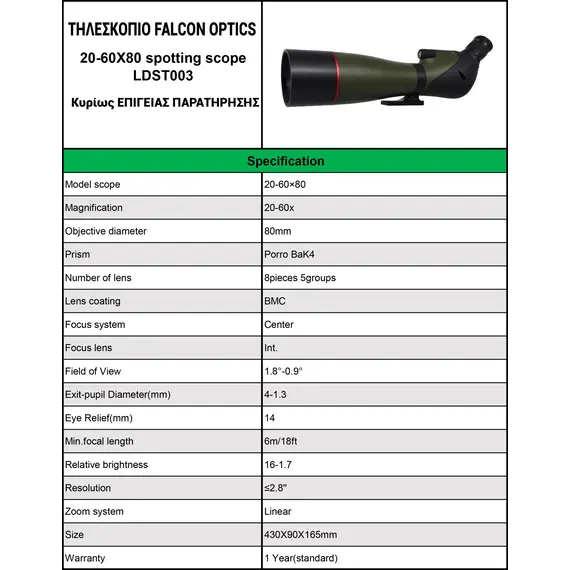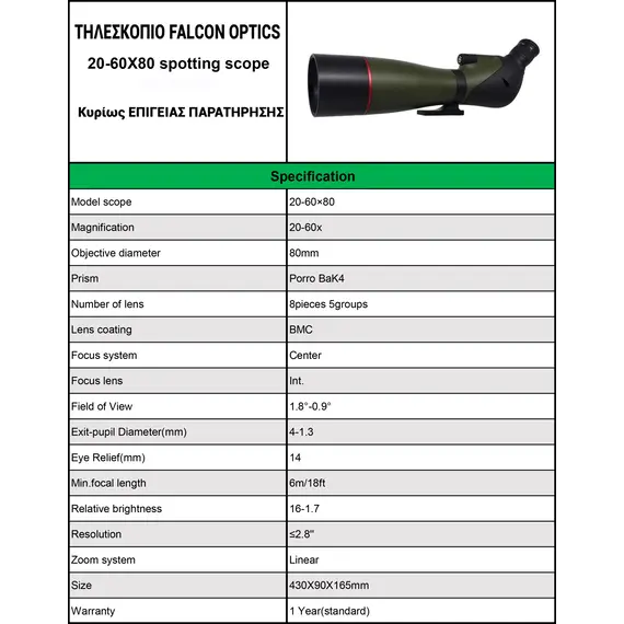 – Τηλεσκόπιο FALCON Optics Spotting Scope 20-60×80
