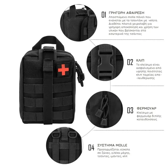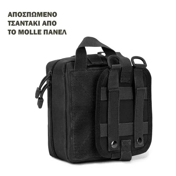 Στο μπροστινό μέρος περιλαμβάνει πάνελ velcro για προσαρμογή σημάτων ή διακριτικών, καθώς και σύστημα molle για προσθήκη επιπλέον θηκών (π.χ. ψαλίδι, τουρνικέ). Στην πίσω πλευρά υπάρχει αποσπώμενο πάνελ με ιμάντες molle για εύκολη και ασφαλή στερέωση σε εξάρτηση ή γιλέκο, επιτρέποντας ταυτόχρονα την άμεση απόσπαση του τσαντιού σε περίπτωση ανάγκης.
