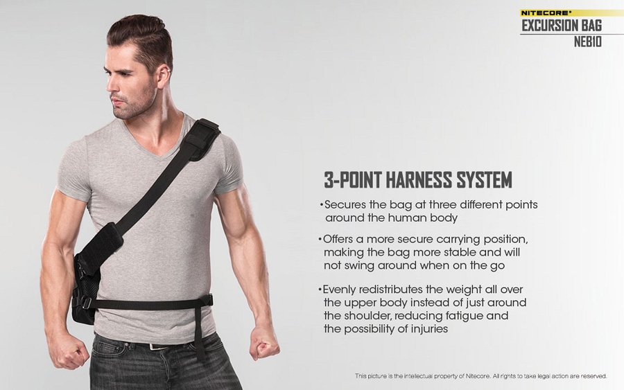 Ένα σύστημα ιμάντων 3-σημείων κατανέμει ομοιόμορφα το βάρος της τσάντα στο σώμα του χρήστη για να παραμένει η τσάντα τοποθετημένη με ασφάλεια καθώς ο χρήστης μετακινείτε και μεγιστοποιεί την άνεση κατά την πάροδο του χρόνου.