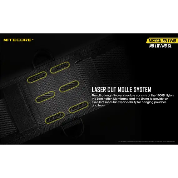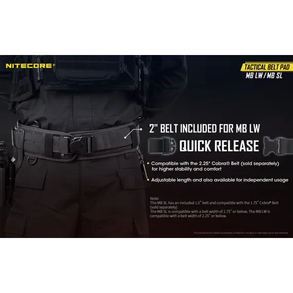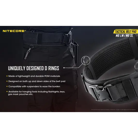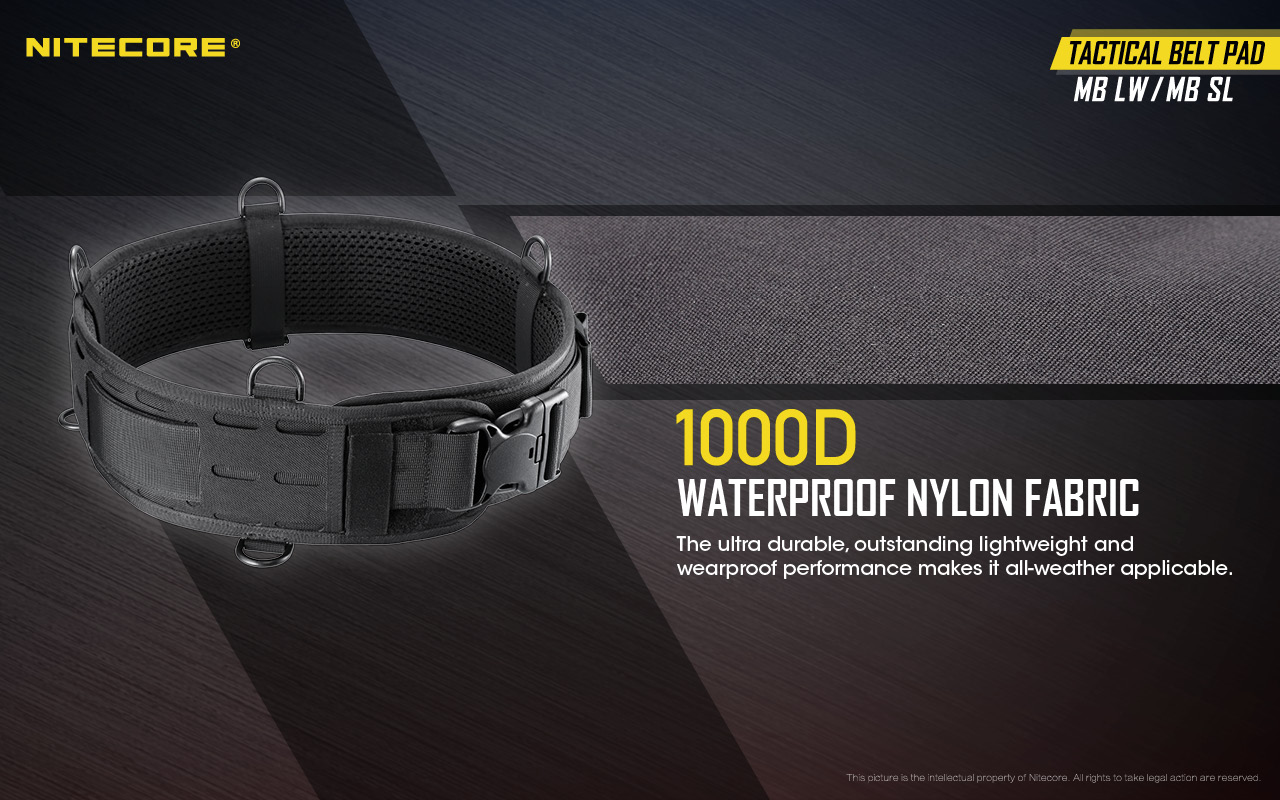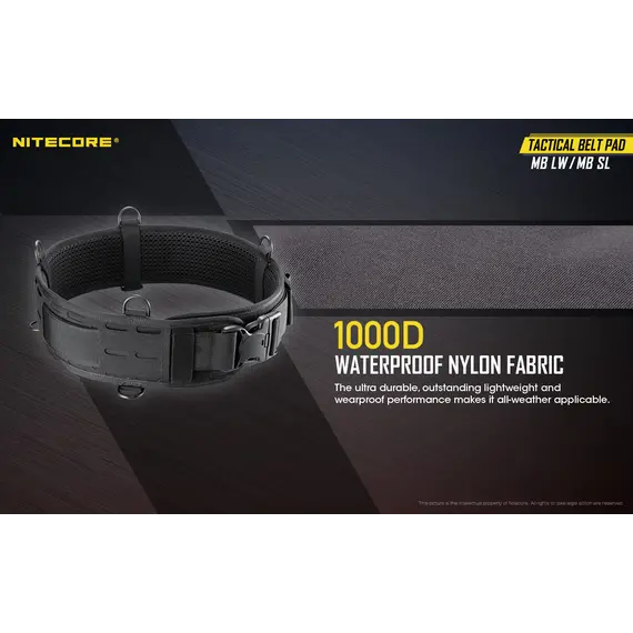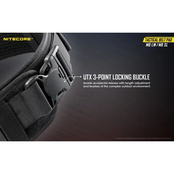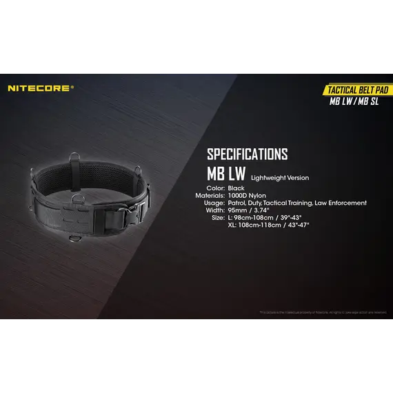 ΖΩΝΗ NITECORE Tactical belt pad, Lightweight, Black, XL Επιχειρησιακή ζώνη με μαλακό γέμισμα. Κατασκευασμένη από συνθετική ίνα με αδιάβροχη πλέξη 1000D , εξαιρετικά ανθεκτική, πραγματικά πολύ ελαφριά και με μεγάλη αντοχή στην φθορά. Ιδανική για όλες τις καιρικές συνθήκες. Διαθέτει σύστημα ανάρτησης MOLLE κομμένο με Laser. Είναι εξαιρετικά ανθεκτικό, κατασκευασμένο από νάιλον 1000D, λεπτή μεμβράνη και φόδρα ώστε να προσφέρει την εξαιρετική επεκτασιμότητα για την ανάρτηση θηκών και εργαλείων. Συμπεριλαμβάνεται ζώνη πλάτους 5 εκατοστών με πόρπη γρήγορης απελευθέρωσης. - Είναι συμβατή με ζώνη 2,25" Cobra® (Πωλείται ξεχωριστά) για μεγαλύτερη σταθερότητα και άνεση - Ρυθμιζόμενο μήκος και ικανότητα να χρησιμοποιηθεί ανεξάρτητα. Πόρπη UTX που ασφαλίζει σε 3 σημεία. Αποτρέπει ατυχή απασφάλιση. Διαθέτει ρύθμιση μήκους και δεν "φοβάται" το πολύπλοκο εξωτερικό περιβάλλον. Μοναδικά σχεδιασμένοι κρίκοι σε σχήμα " D " - Κατασκευασμένοι από ελαφριά και ανθεκτικά υλικά POM - Τοποθετημένοι και στις δύο πλευρές τις ζώνης. - Είναι συμβατοί με τιράντες ξεκούρασης για μείωση της κόπωσης λόγω βάρους. - Είναι διαθέσιμοι για την ανάρτηση εργαλείων, όπως φακοί, κλειδιά, θήκες για αντιασφυξιογόνες μάσκες κ.α. Σύστημα ανάρτησης και μεταφοράς εξοπλισμού που αναπνέει. Ο συνδυασμός του τρισδιάστατου διχτυωτού μαλακού επιθέματος και του διάτρητου μαλακού υλικού EVA μπορεί και μοιράζει την πίεση της ζώνης για να προσφέρει μεγαλύτερη εργονομία και άνεση. Περιοχή ασφάλισης με υλικό τύπου Βέλκρο για καλύτερο δέσιμο και ασφάλεια. Εφαρμόζει τέλεια και αγκαλιάζει την ζώνη την μέση και την στολή σας. Τεχνικά χαρακτηριστικά MB LW Lightweight Χρώμα: Μαύρο Υλικό: Nylon 1000D Χρήση: Περιπολία, Υπηρεσία, Επιχειρησιακή εκπαίδευση, Σώματα ασφαλείας. Πλάτος: 95mm Μήκος: Large: 98cm - 108cm